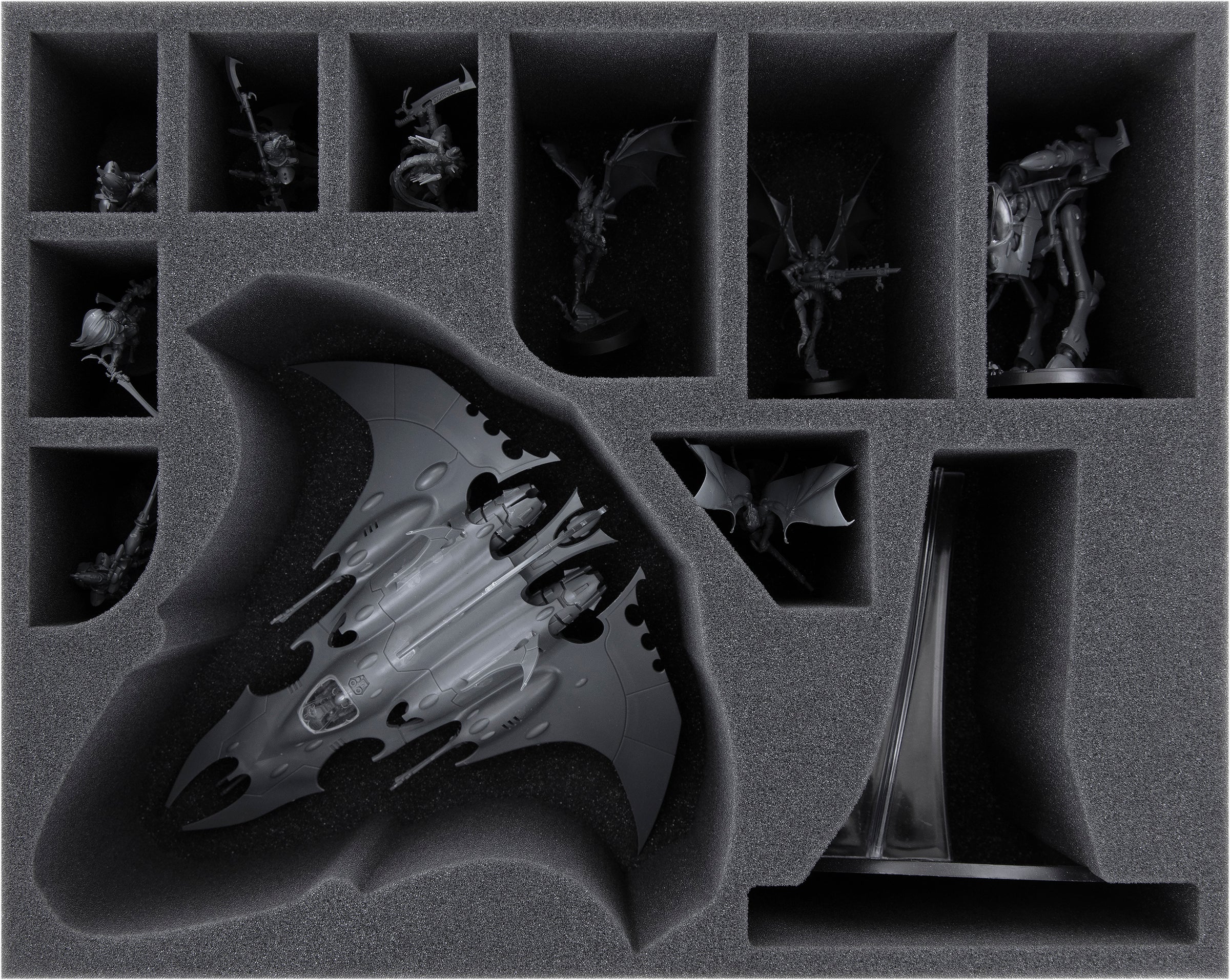 - 1 Full-Size foam tray with 1 miniature-precisely cut compartment for Hemlock Wraithfighter / Crimson Hunter, 1 precisely cut compartment for the Flying Base and 9 compartments for units on Jetbikes with Flying base like Shroud Runners, Windriders, big infantry units like War Walker, Winged Autarch, standard infantry like Howling Banshees, Dire Avengers and models with similar dimensions (FSMEXD105BO)