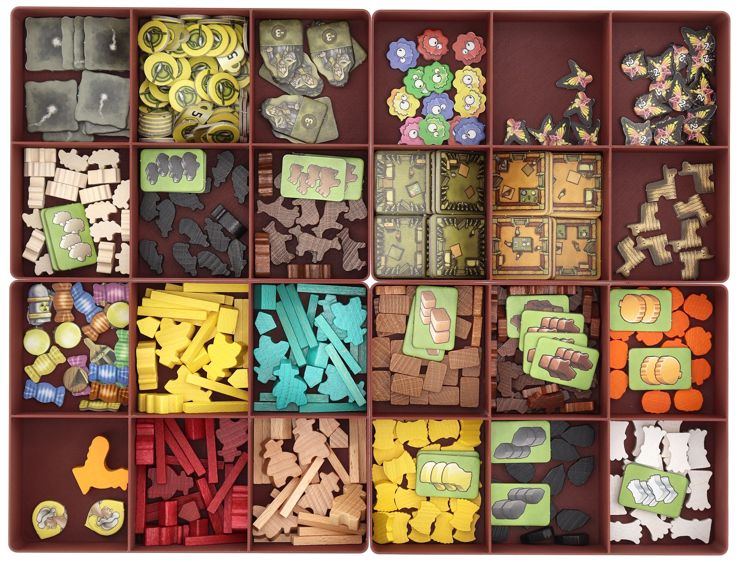 - The original cardboard sorting trays are replaced by four sturdy token trays. These offer more compartments, an improved sorting structure, and are more durable and stable than the shaky cardboard version.