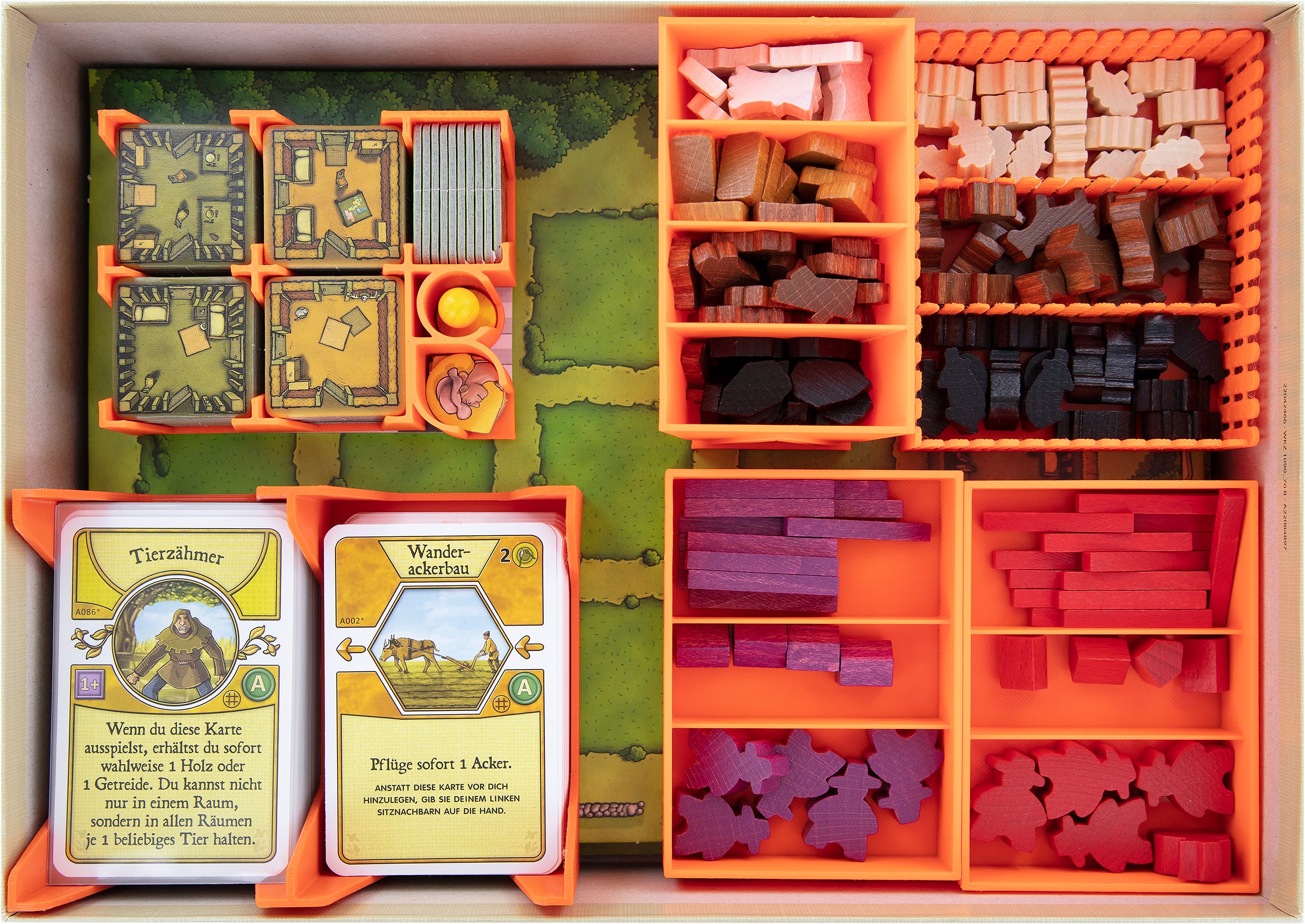 - 2 compartments offer enough room to sort action space cards, red „major improvement", yellow "occupation" and orange „minor improvement" cards