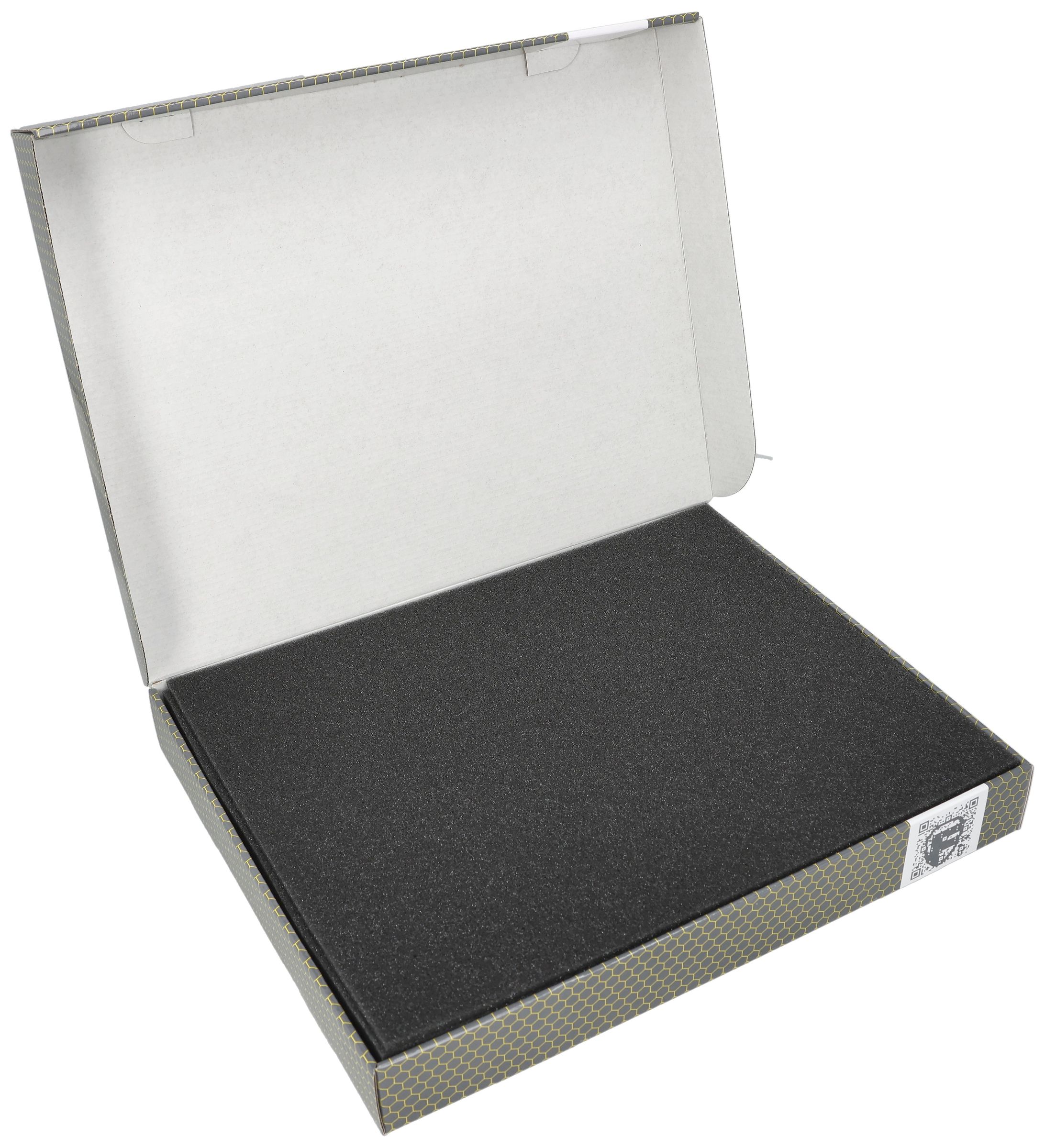 La bandeja de espuma Full-Size tiene las dimensiones: 345 mm x 275 mm x 40 mm de altura total (30 mm de altura útil + 10 mm de base de espuma).