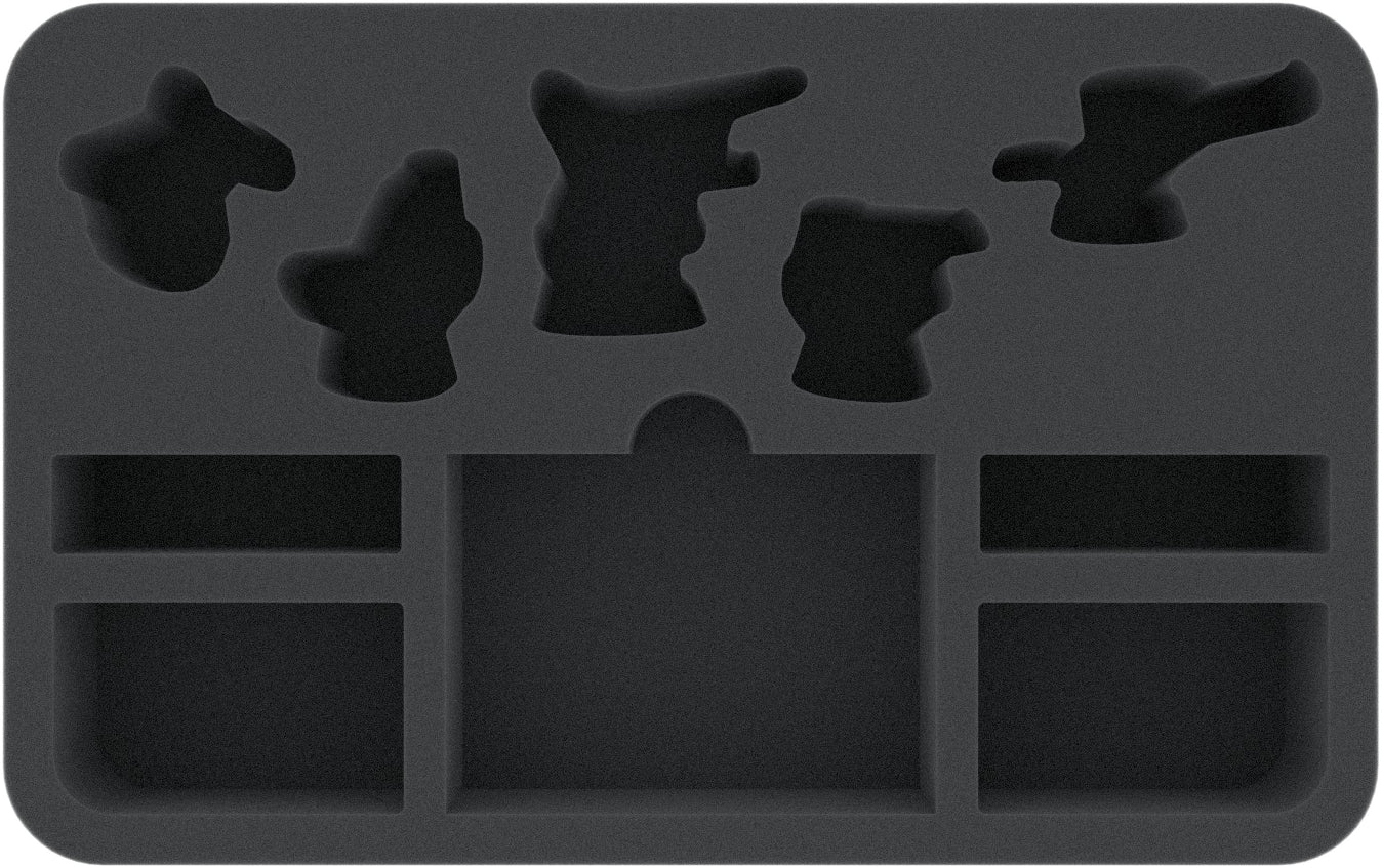 Las cinco figuras encuentran su refugio seguro en cinco compartimentos adaptados exactamente a su medida. Especialmente con las figuras pintadas, el almacenamiento seguro es importante para que los colores se conserven y no se desprendan. Las partes sensibles, como espadas o pedestales, también están protegidas contra dobleces o roturas.