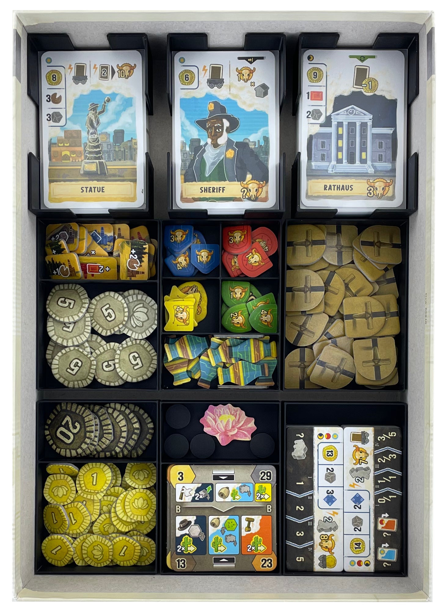 • 3 token holders, each with 2 compartments for small game material like region markers, starting player token, solo tiles, coins, production sites