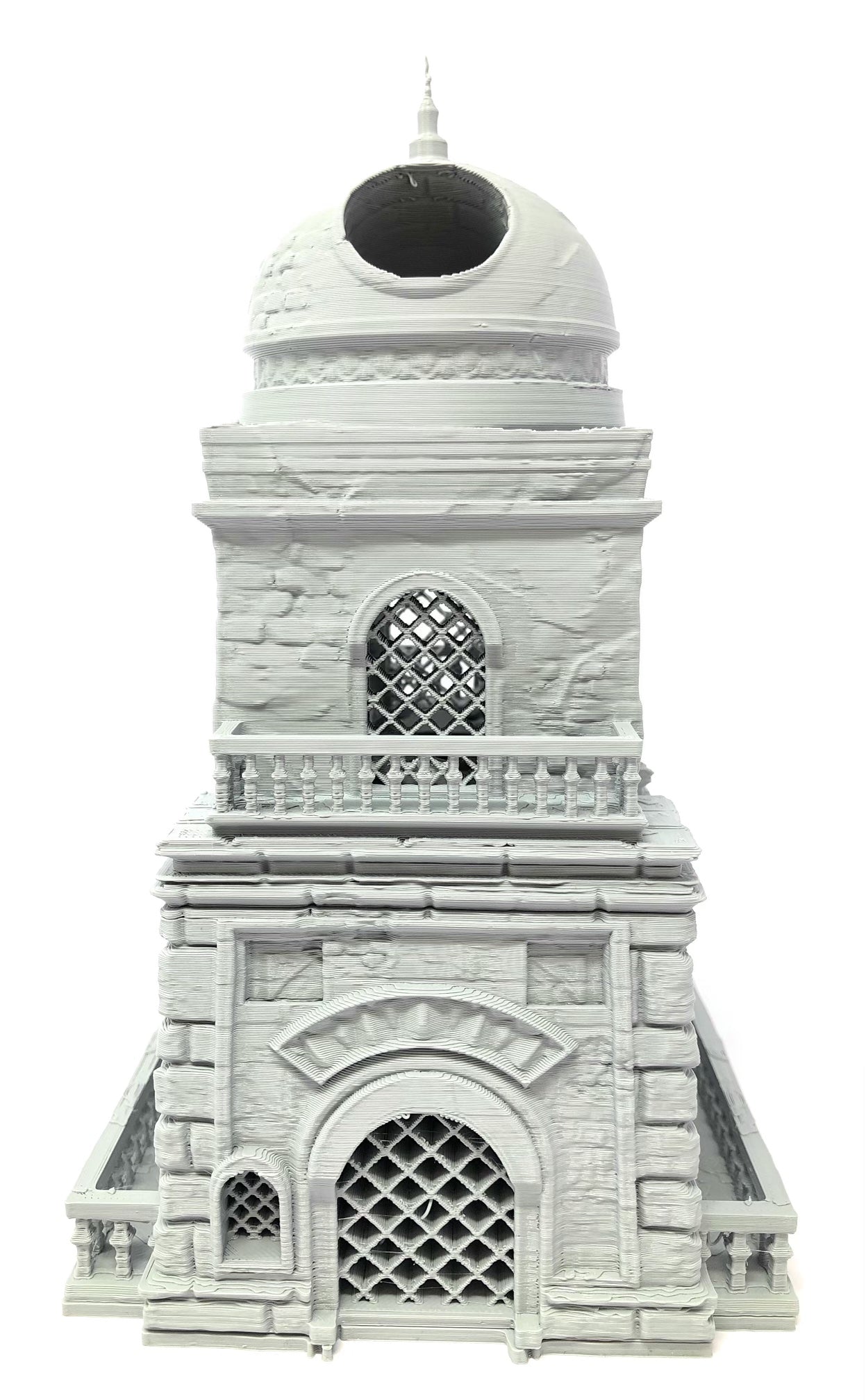 3D printed - detailed dice tower, with removable roof and exchangeable dice tray. The Dice Tower can also be used as a terrain part for your miniatures game or as a center piece for your next DnD session.