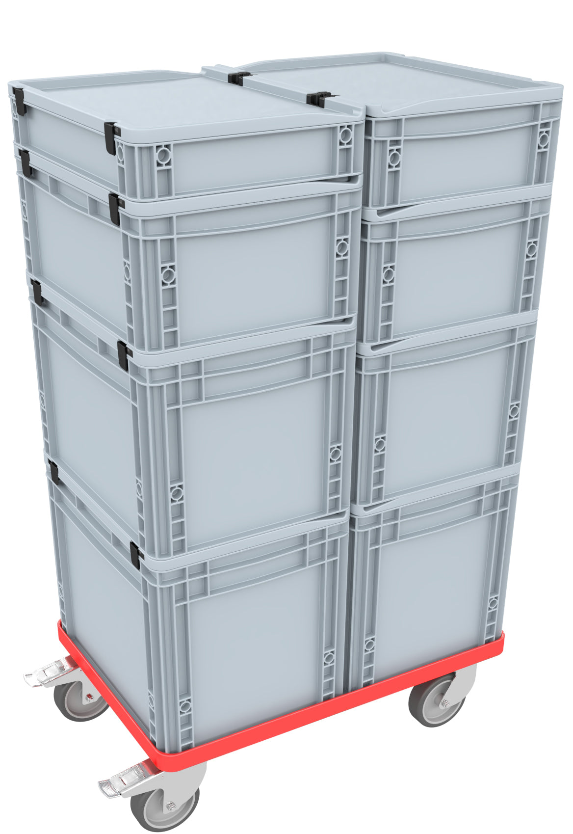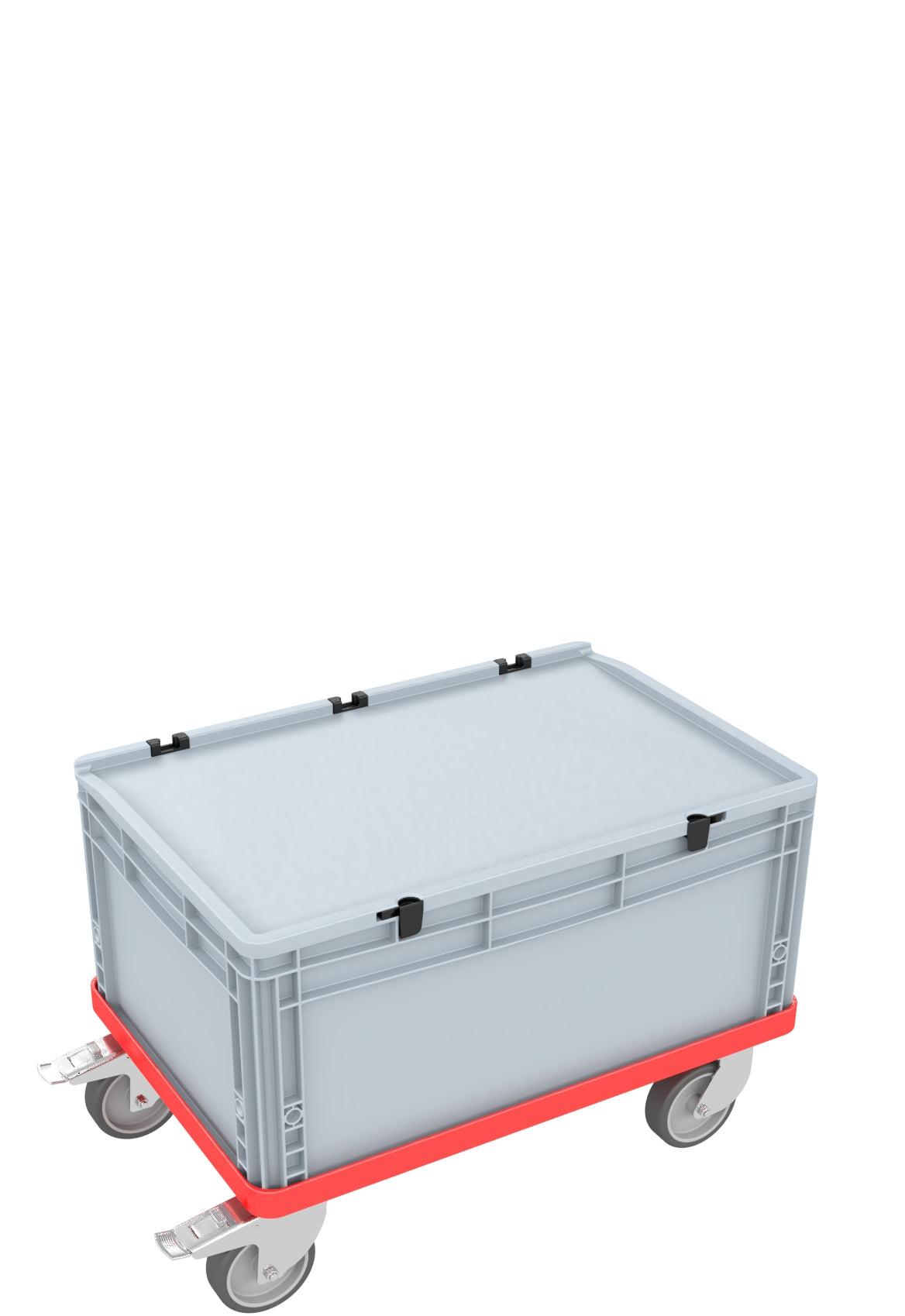Compact trolley with rubber wheels red and wheel stop for Euro Container up to 600 mm x 400 mm