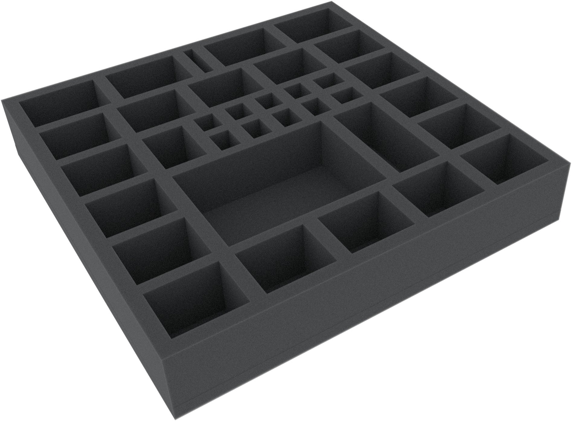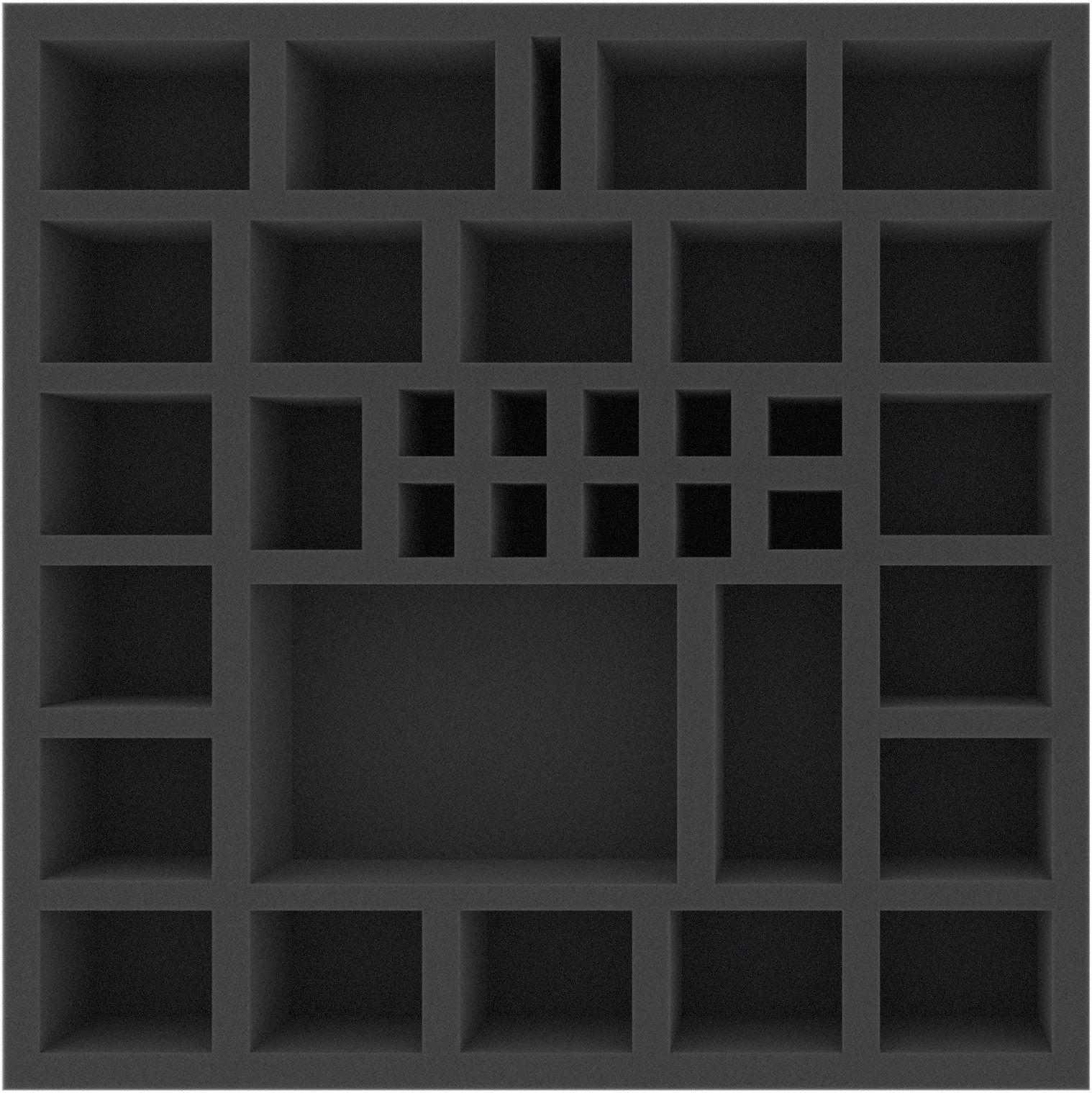 Esta bandeja de espuma tiene 34 compartimentos para el almacenamiento seguro y ordenado de material de juegos de mesa como miniaturas, fichas y dados. La espuma de poros finos proporciona una protección fiable contra los daños.