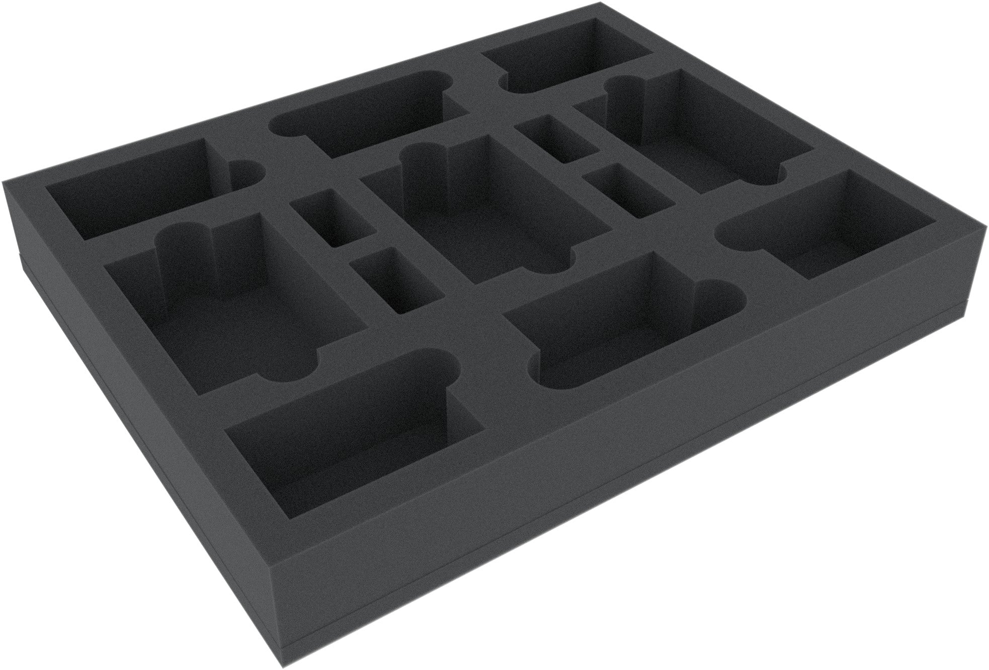 Esta bandeja de espuma tiene 13 compartimentos para accesorios. 3 compartimentos son adecuados para cartas con mangas, 6 compartimentos contienen cartas más pequeñas y 4 compartimentos adicionales son ideales para guardar, por ejemplo, los dados.