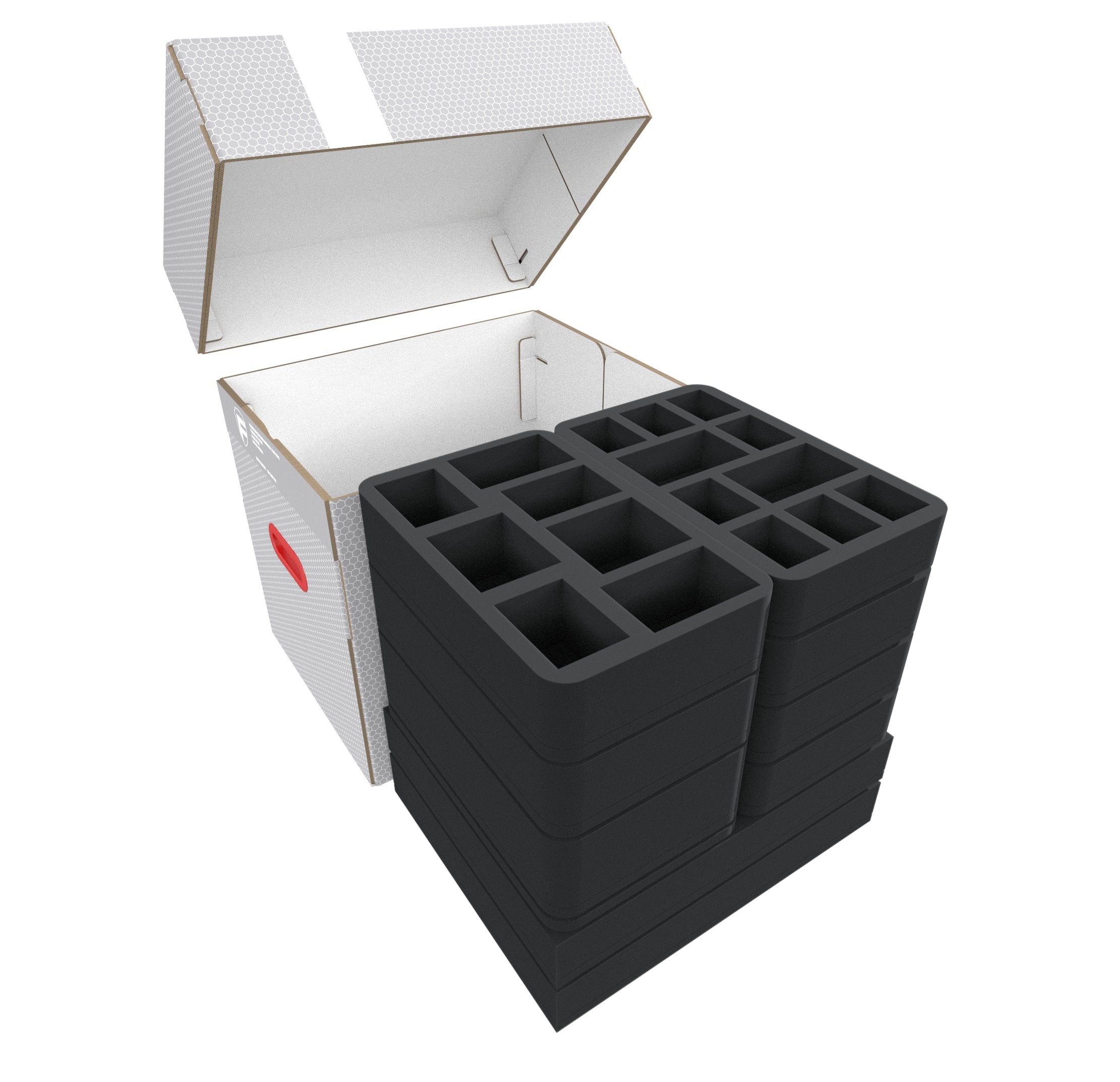 Gracias a la probada experiencia del Feldherr, puedes organizar todas las miniaturas de la caja de Indomitus y transportarlas de forma segura. El juego contiene un total de 8 bandejas de espuma. No importa si el Outrider en bicicleta o el mortal Señor Skorpekh, cada uno de los 61 las figuras obtienen su compartimento. Con espacio adicional para más de 35 figuras adicionales. Esto evita que sus figuras se deslicen y se dañen. Debido a la espuma suave y de poros finos, los colores de sus modelos pintados no se ven afectados. de la abrasión y los arañazos.