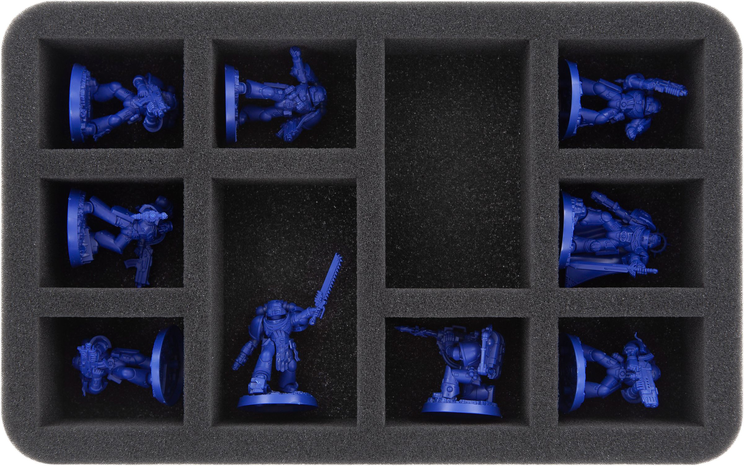 Para los hermanos restantes de su tropa, como el Capitán, el Teniente, el Capellán, y los diez Intercesores de Asalto, hay un lugar adecuado para cada miniatura en los dos insertos de espuma con diez compartimentos cada uno (HSLM050BO).