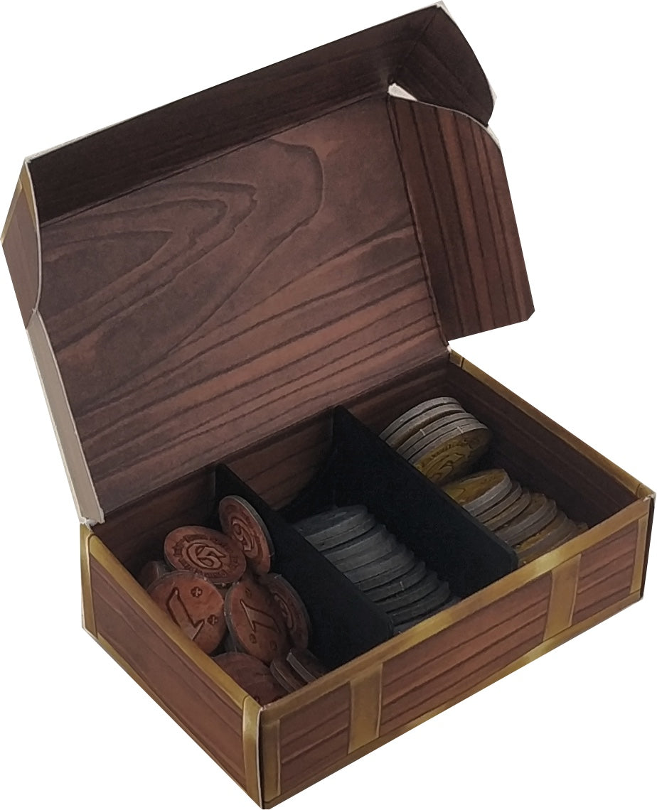 - Sort other game materials like player markers, player discs, gray cylinders, initiative markers, guilders, and 3D wooden letter block types in the cardboard chests provided.