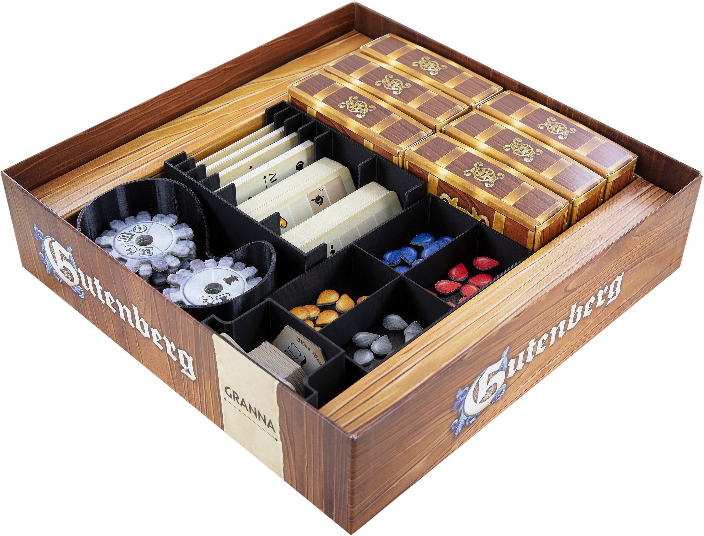 - The Organizer fits exactly into the original board game box of the Gutenberg core game by Granna.