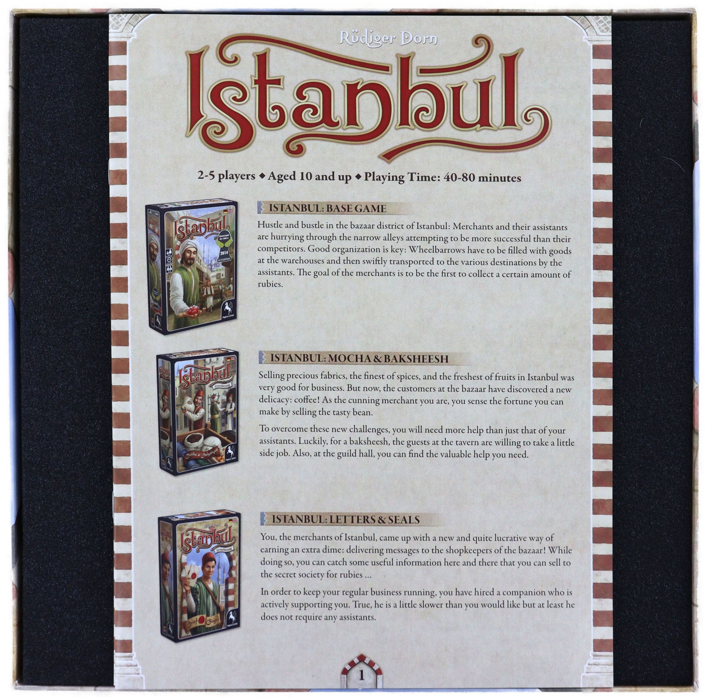 - It accommodates all game accessories, including the core game and expansions "Mocha & Baksheesh" and "Letters & Seals."