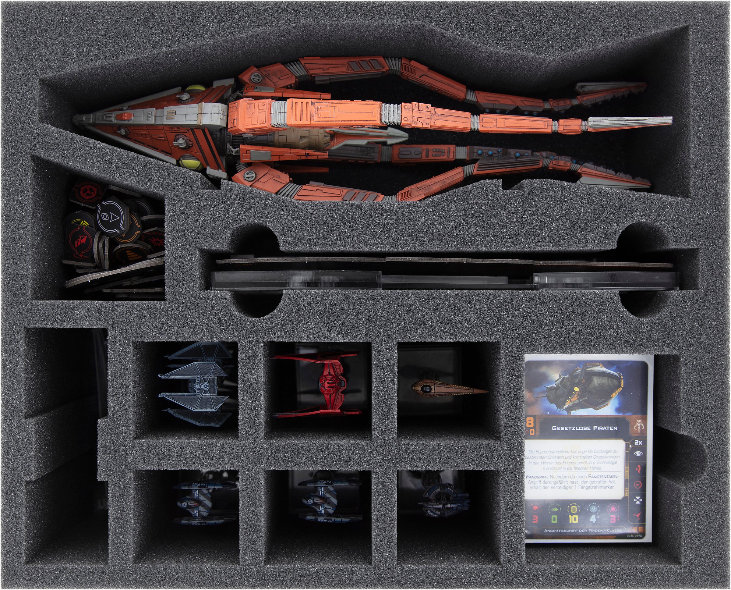 - 1 bandeja de espuma Full-Size para 1 nave de asalto clase Tridente, 6 cazas, cartas y material de juego (FSMFDX110BO)