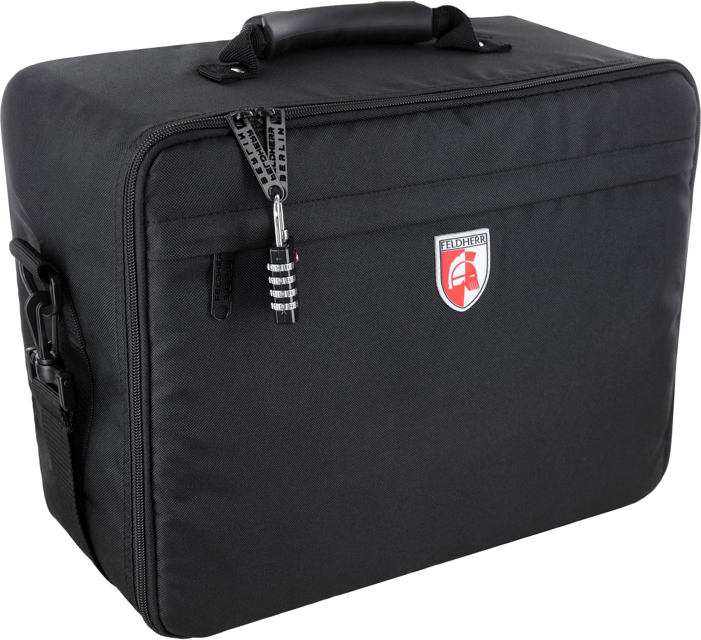 La bolsa negra Feldherr MAXI PLUS está fabricada con un tejido especialmente resistente. Además, los paneles laterales acolchados y la base reforzada garantizan una protección óptima del contenido frente a las influencias externas, incluso cuando se transporta en coche o tren. También se puede bloquear y conectar con un candado opcional. Junto al gran compartimento principal, el bolso tiene un bolsillo más pequeño con cremallera en la parte delantera. Aquí se pueden guardar, por ejemplo, hojas de juego, libros y material de escritura.