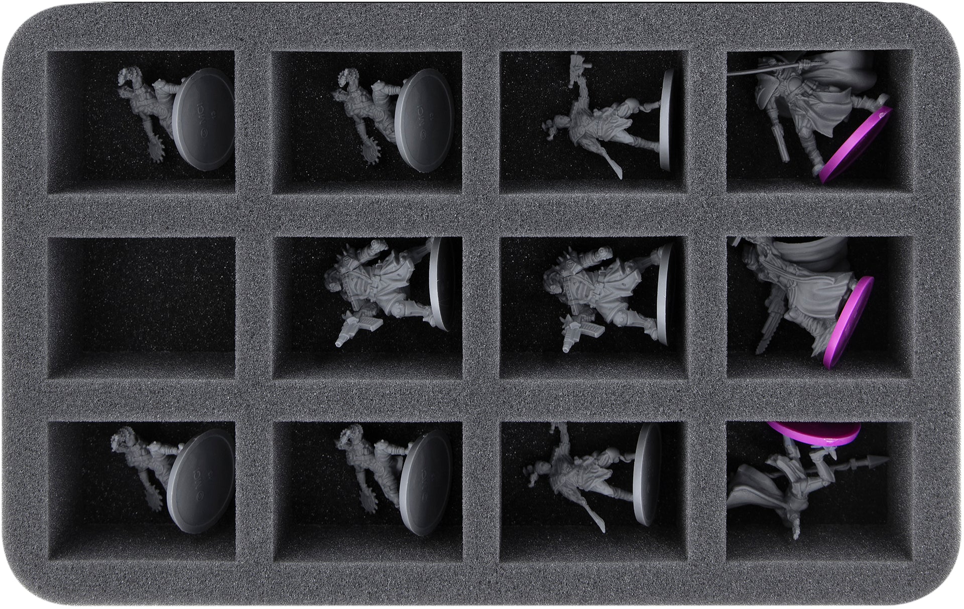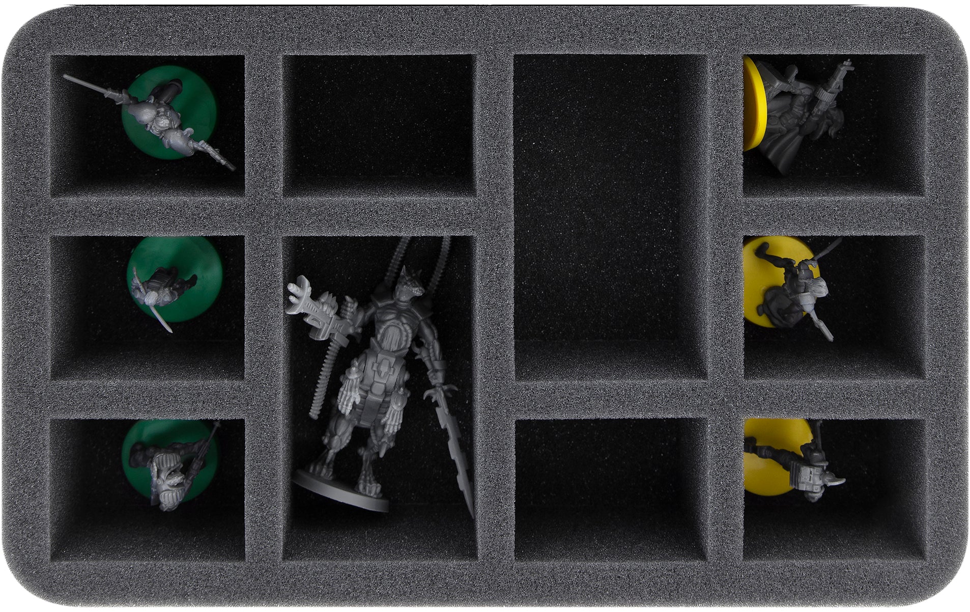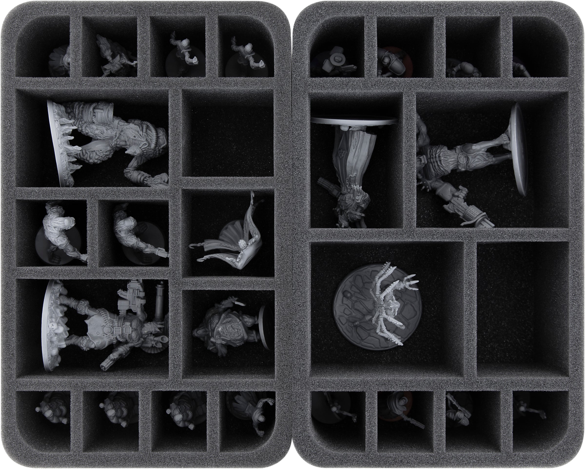 Un compartimento para cada miniatura, ya sea una simpática figura Chibi de bonificación, el gigantesco Apóstol Algeroth o una de las muchas monstruosidades de la Legión Oscura. Cada una de tus miniaturas encontrará un compartimento para encajar en las cuatro bandejas de espuma Feldherr Half-Size de espuma.