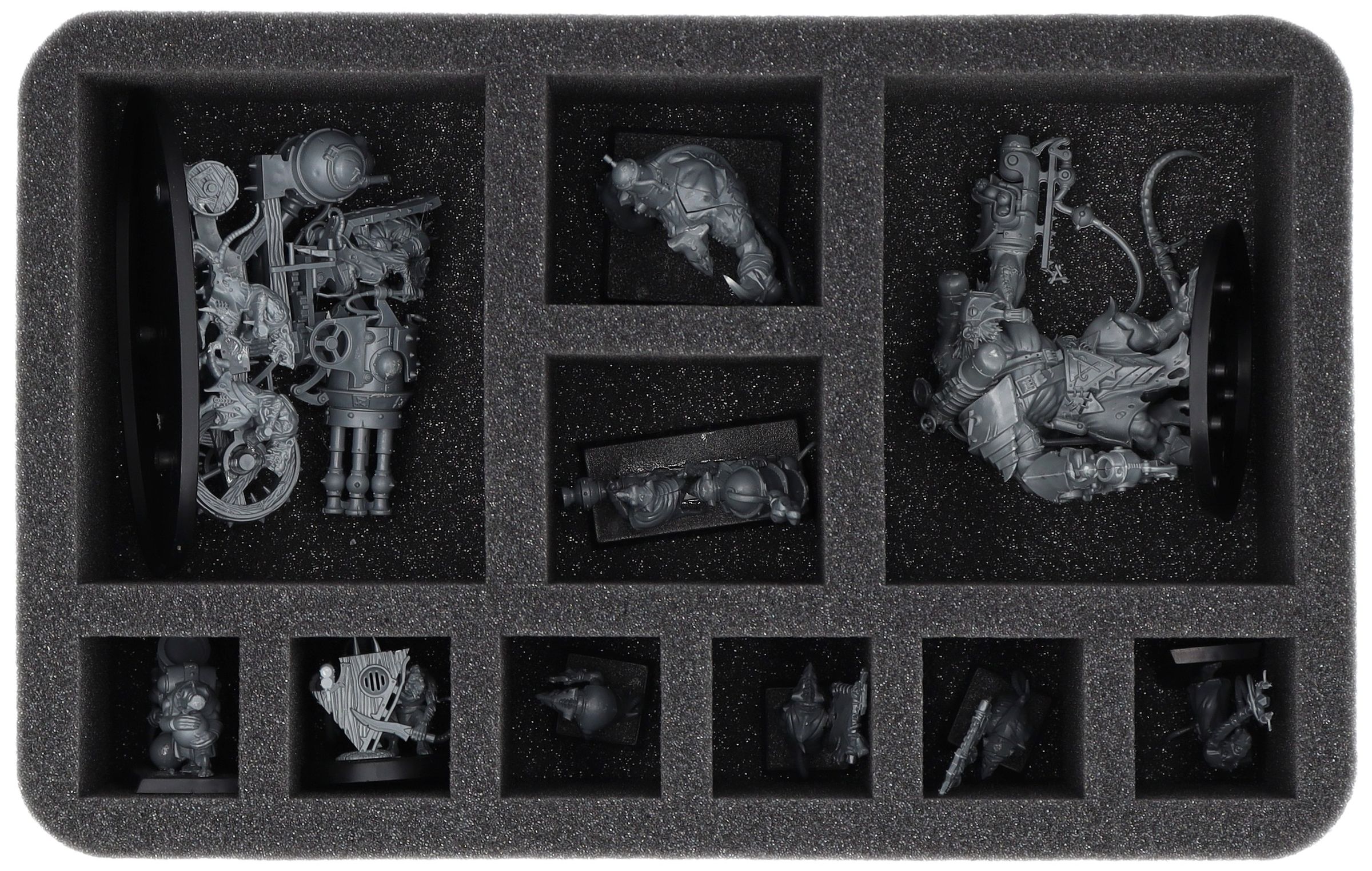 • 1 bandeja de espuma de tamaño medio con 10 compartimentos para miniaturas como los Rat Ogors, Ratling Warpblaster y modelos de tamaño similar (HS080A031)