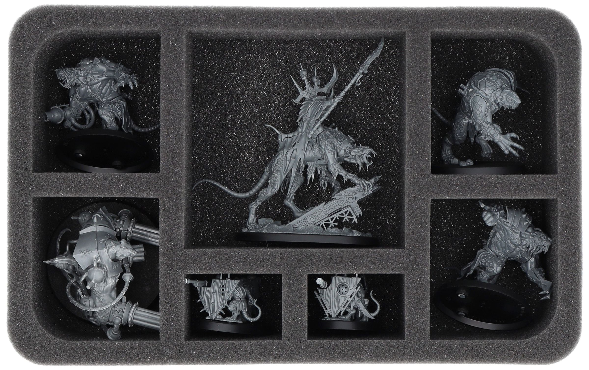 • 1 bandeja de espuma de tamaño medio con 7 compartimentos para miniaturas como el Clawlord en Gnaw-Beast y modelos de tamaño similar (HS080A032)