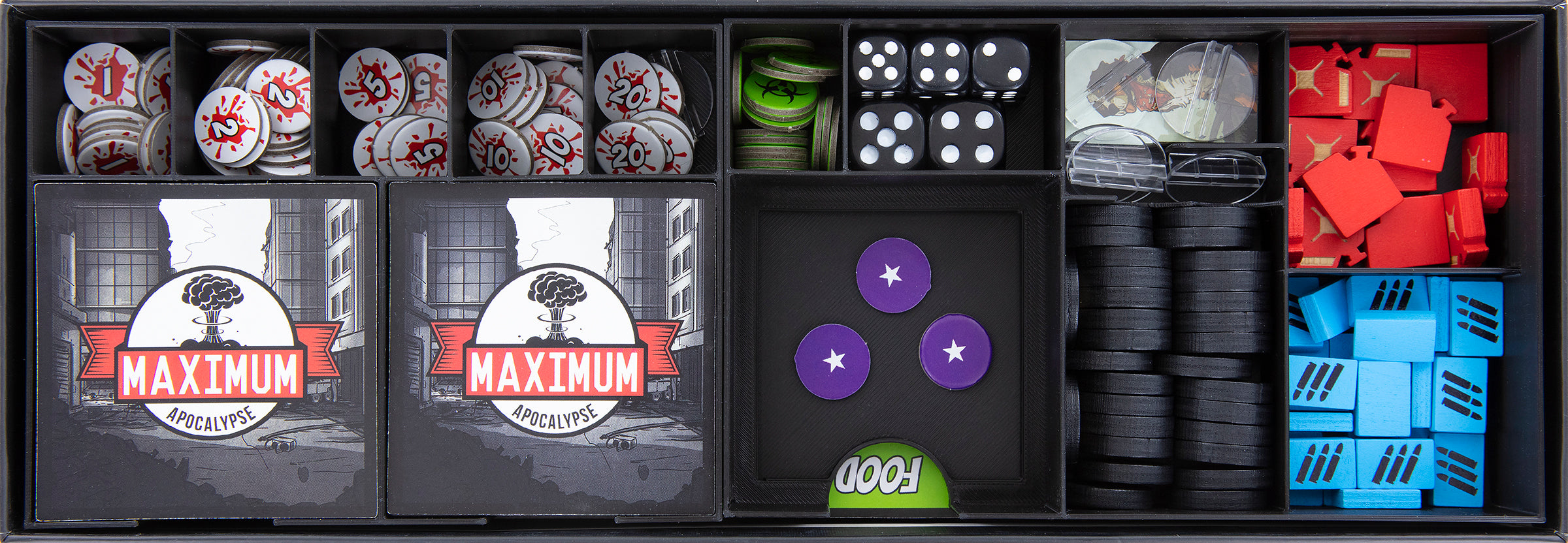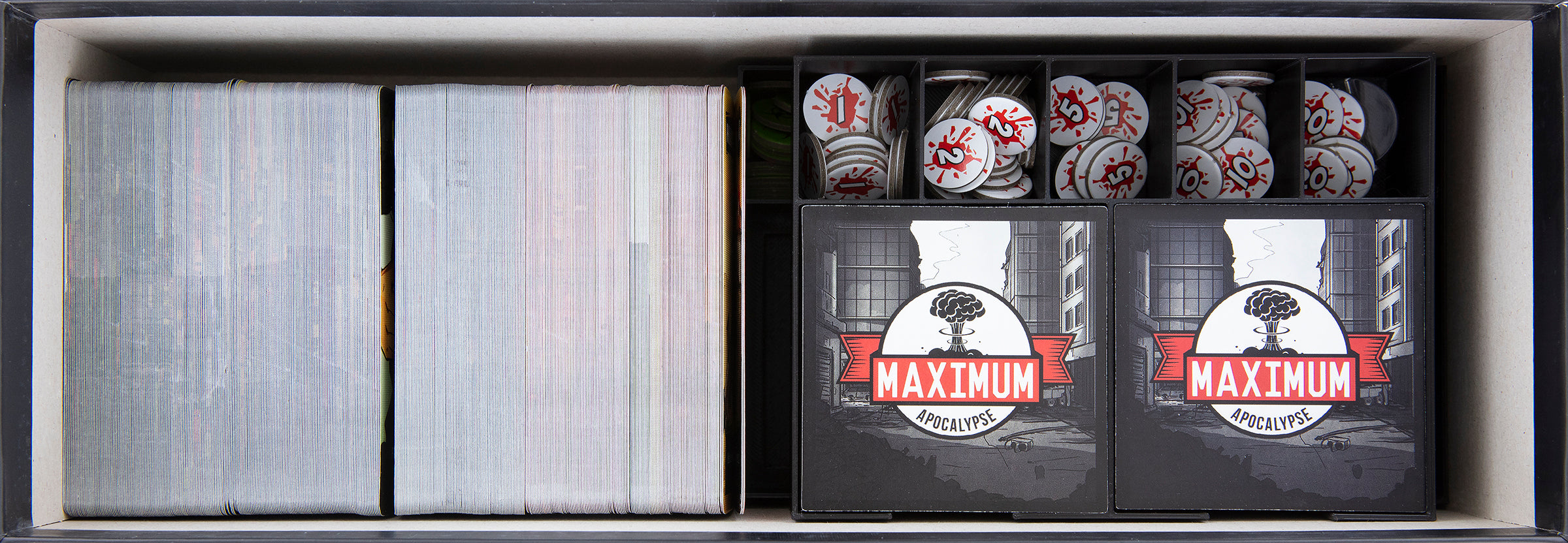 • The Organizer fits into the original board game box of the core game for “Maximum Apocalypse.”