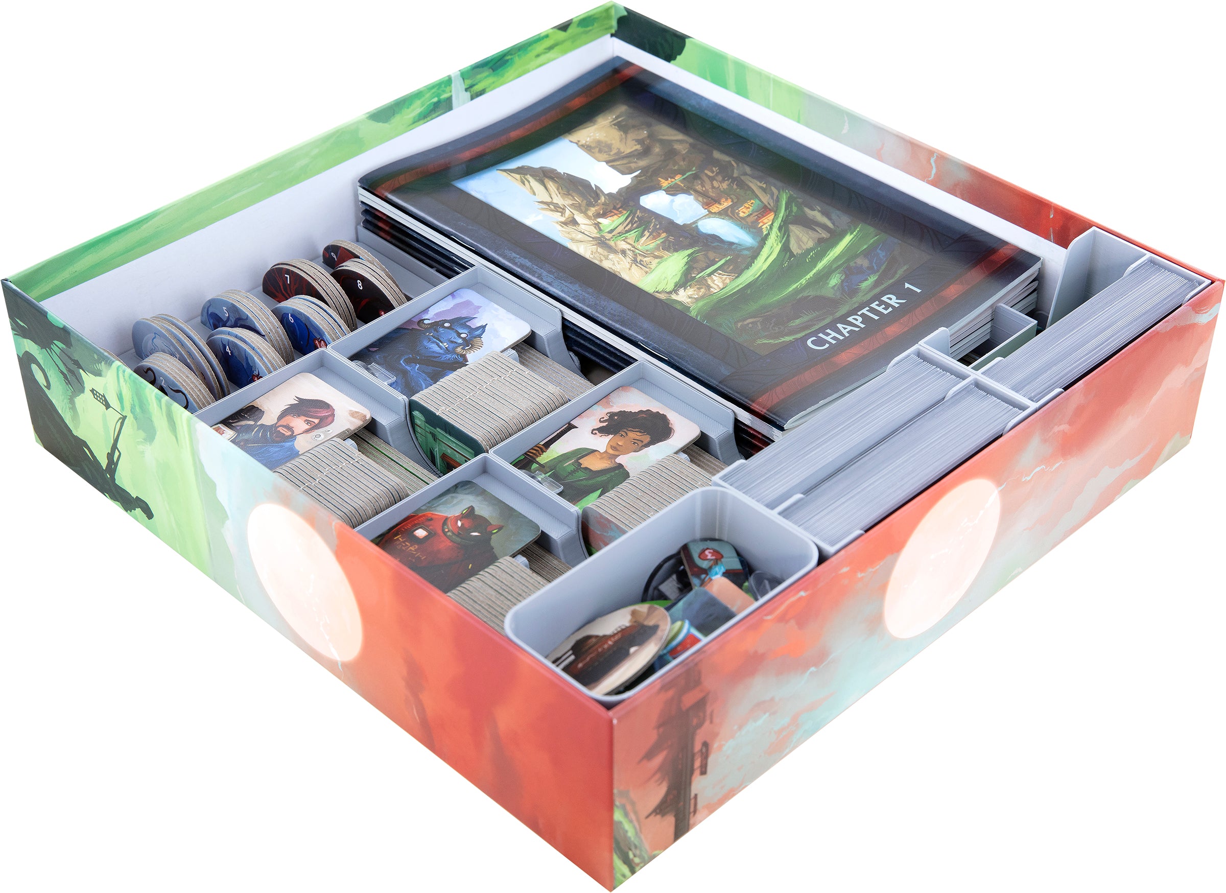 While you’re poking around the ruins of your old home, we’ll make sure you don’t have to do that in your board game box. Thanks to the eight token holders and two card holders, your board game box is perfectly sorted. This eliminates the agonizing search for the correct token, and you have the game set up quickly. After the game, you put the different components into the trays. This also does not take long, and you are directly ready for another round.