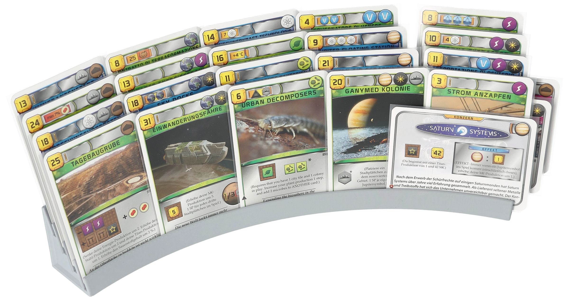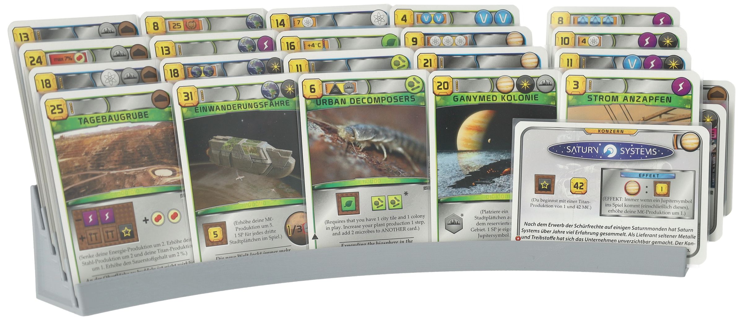 - Cada soporte ofrece espacio para hasta 20 cartas: cuatro ranuras proporcionan espacio suficiente para colocar sus cartas en mano (cartas de corporación y de proyecto) delante de usted de forma ordenada