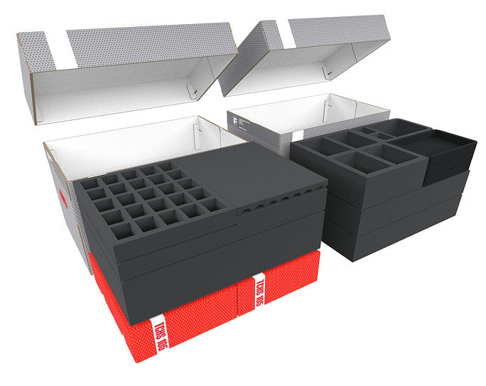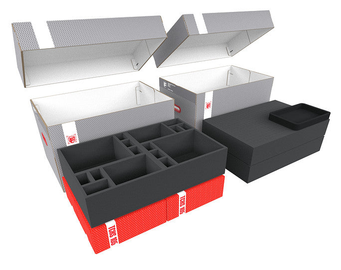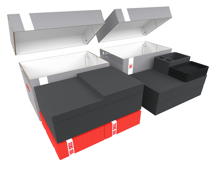 El set incluye los dos espaciosos Storage Boxes DSLB310, repletos de Feldherr bandeja de espuma de alta calidad, y espuma en cubos espuma para la protección de tus maquetas, así como Storage Boxes TCHS105 con bandejas Organizer para tus fichas y material de juego. De este modo, tus figuras estarán guardadas de forma segura y tu material de juego, perfectamente organizado.