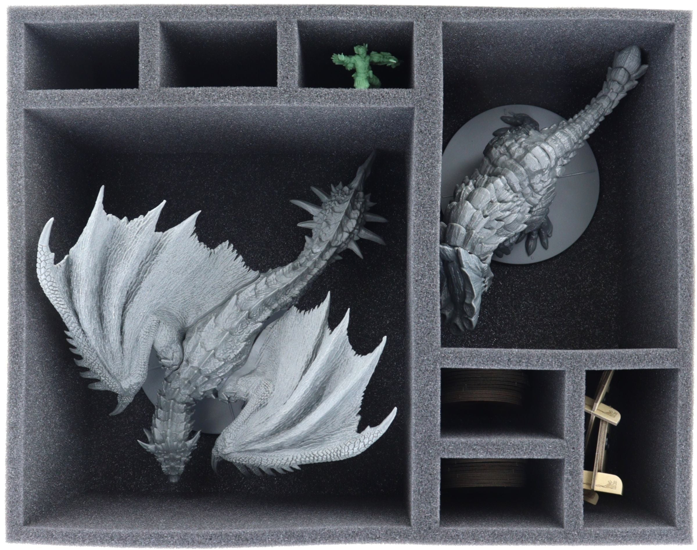 • 1 Full-Size bandeja de espuma con ocho compartimentos para Rathalos, Barroth, Cazador Miniaturas + materiales de juego como Fichas de Salud, Fichas de Terreno (FSMFGW120BO)