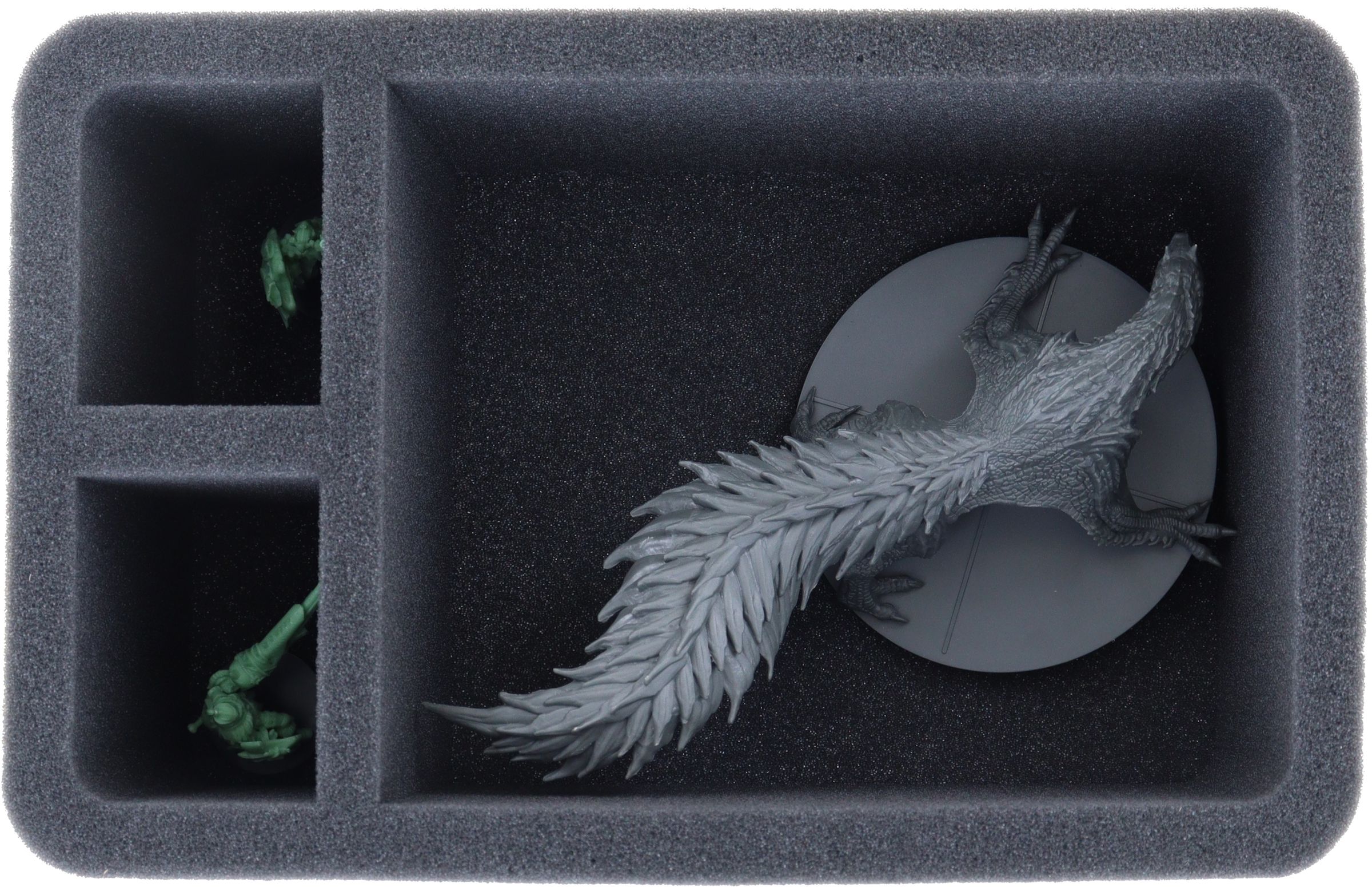 Cada cazador, cada compañero Palico y, por supuesto, cada monstruo tiene su propio compartimento, gracias al corte a medida las figuras permanecen seguras en su sitio incluso cuando se transportan por terrenos escarpados. Rodeadas de suave espuma, las miniaturas están óptimamente protegidas. Incluso las impresionantes alas y garras de los monstruos permanecen ilesas, al igual que las armas de tus cazadores. Y si además pintas tus figuras, puedes estar seguro de que los colores permanecerán libres de arañazos y abrasión.