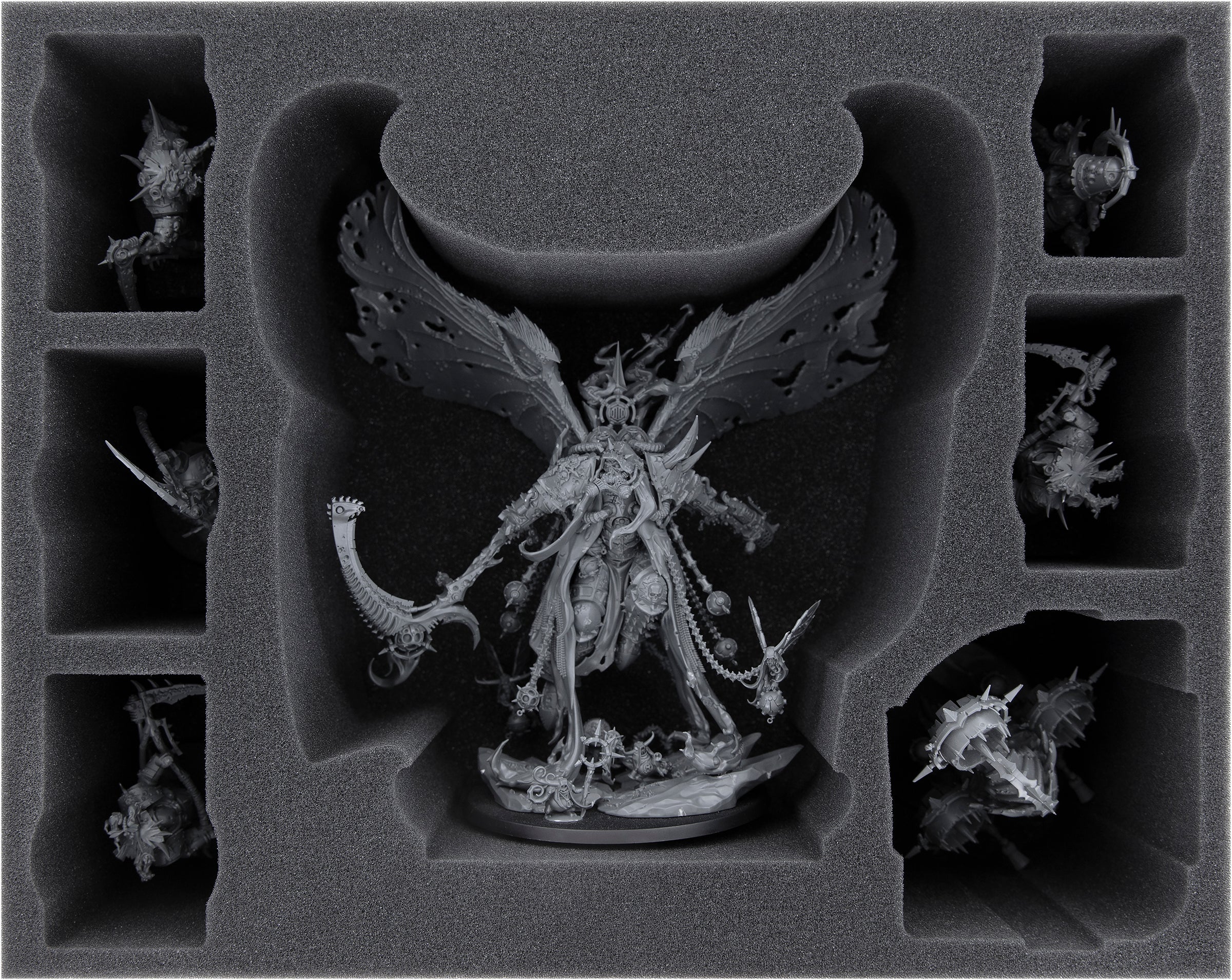 La bandeja de espuma Full-Size de 120 mm de altura ofrece una protección óptima para Mortarion con un compartimento adaptado exactamente al Señor de la Muerte. Sus enormes alas, la guadaña y los drones Nurgling permanecerán intactos en el futuro.