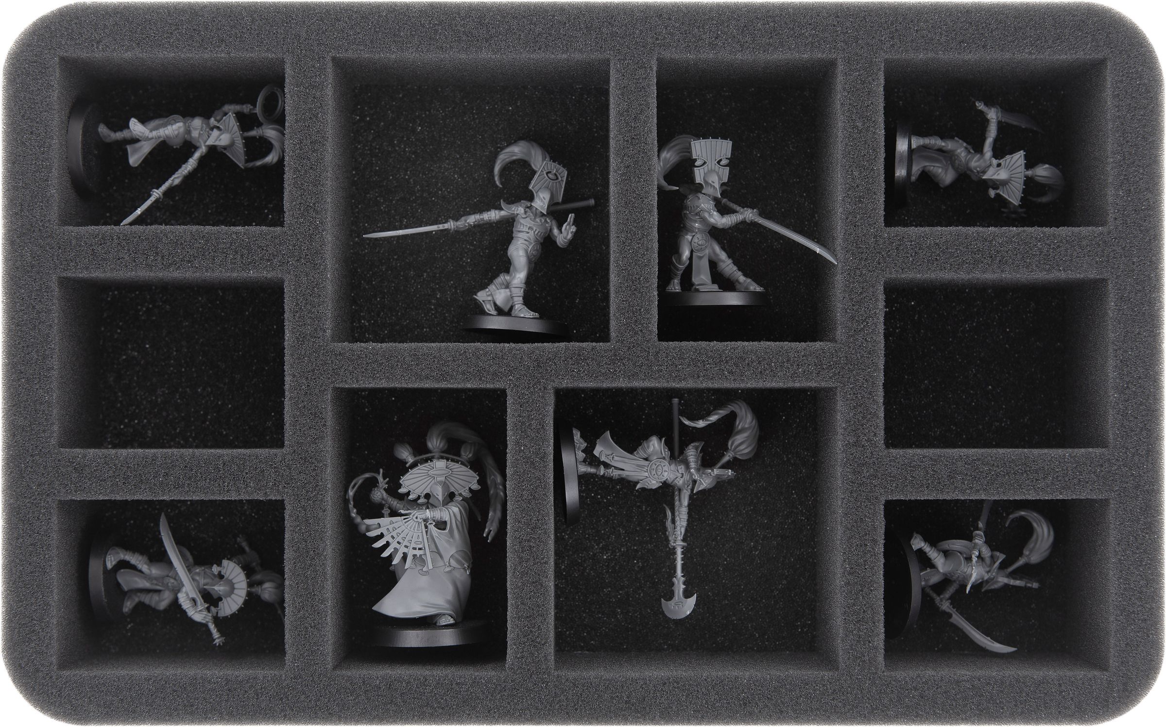 Rodeado de espuma suave, el Thrallmaster, Luminate, los Mirrorblades y los Mindbounds están en buenas manos. Las figuras de filigrana no sufren ningún daño y el Gleve permanece tan afilado como la espada de doble filo. Gracias a la precisión del corte, incluso los modelos pintados con esmero están protegidos de la abrasión y los arañazos.