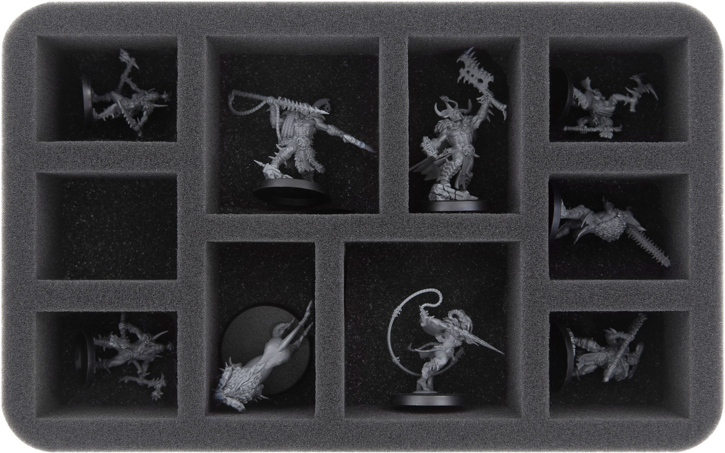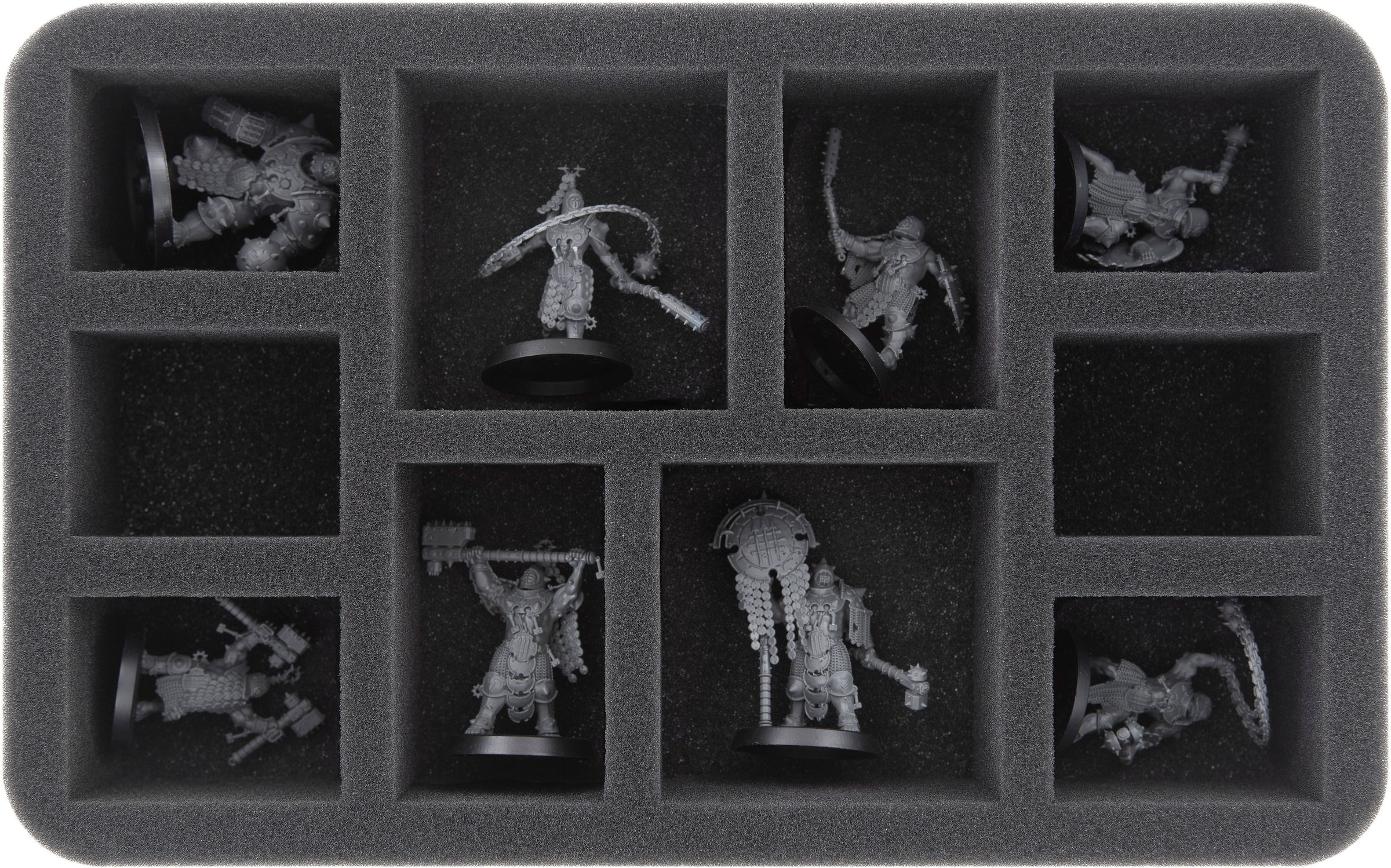 El inserto le ofrece 10 compartimentos para sus modelos de guerreros, uno hecho a medida. para cada miniatura. 2 compartimentos quedan a su libre disposición.