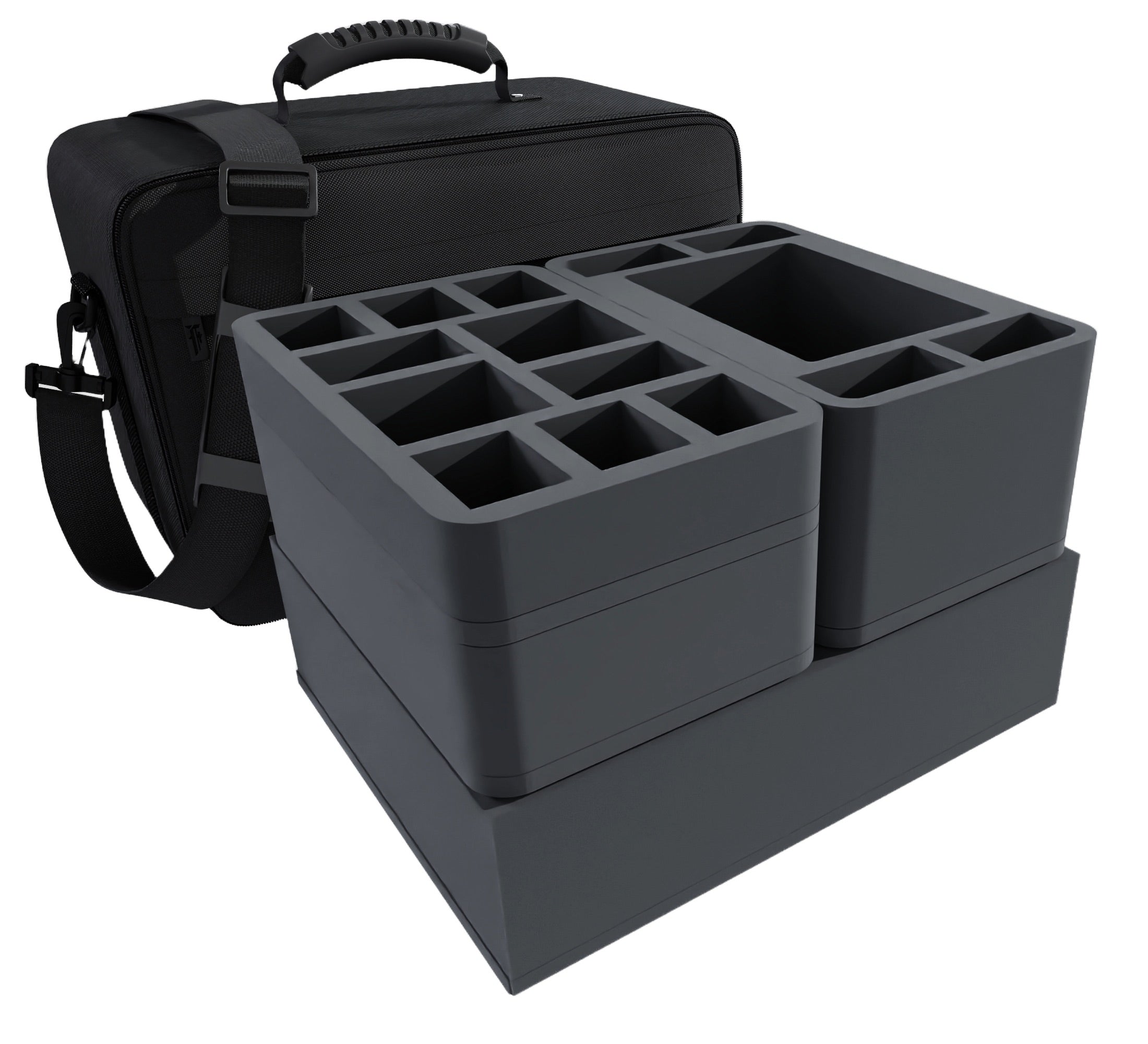 Un Full-Size y tres Half-Size bandeja de espuma proporcionan una protección fiable para tu miniaturas: cada miniatura recibe su propio compartimento cortado a medida.