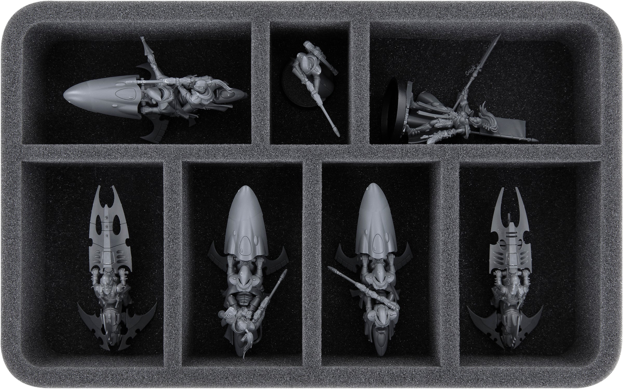 - 1 Half-Size bandeja de espumas con 7 compartimentos para Starweaver/Voidweaver sin bases voladoras + miniaturas voluminosos como Shadowseer, Death Jester y modelos con dimensiones similares + base voladora separada (HS080A027)