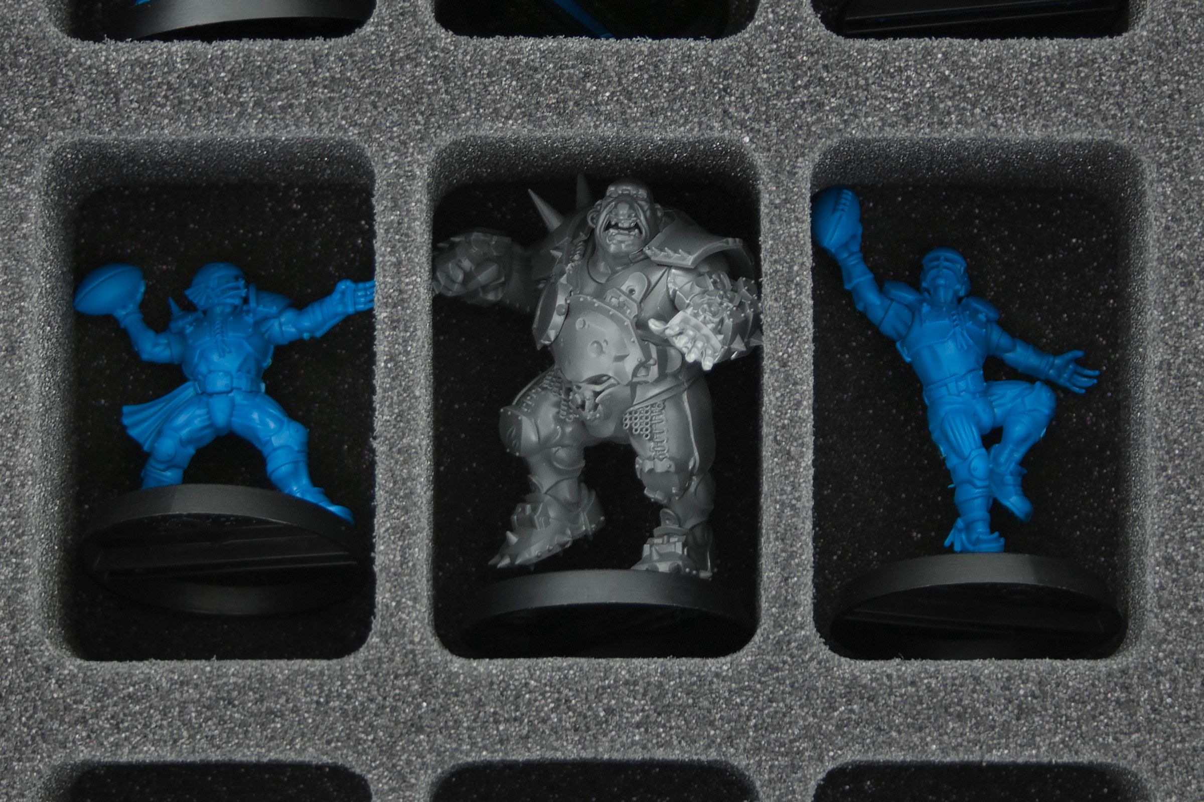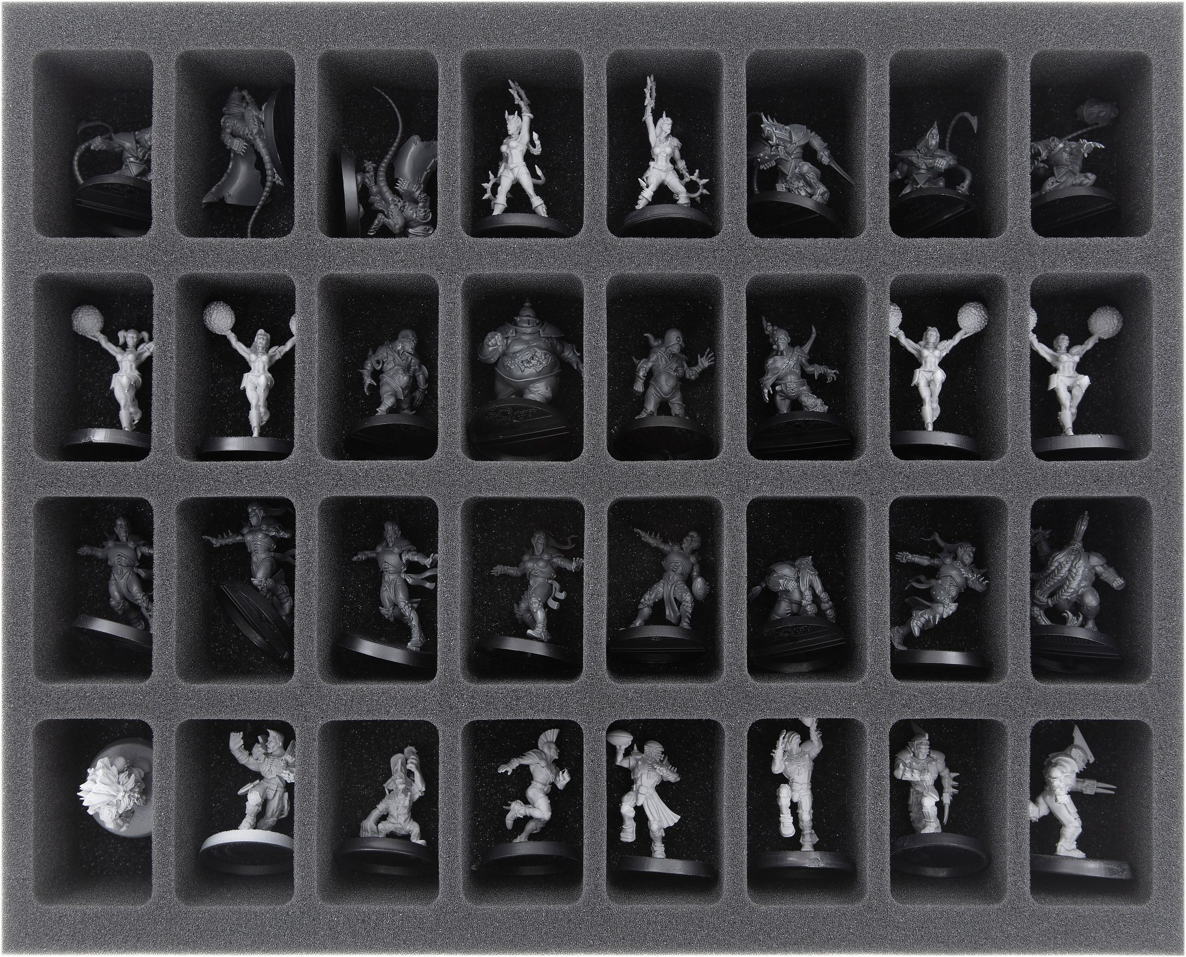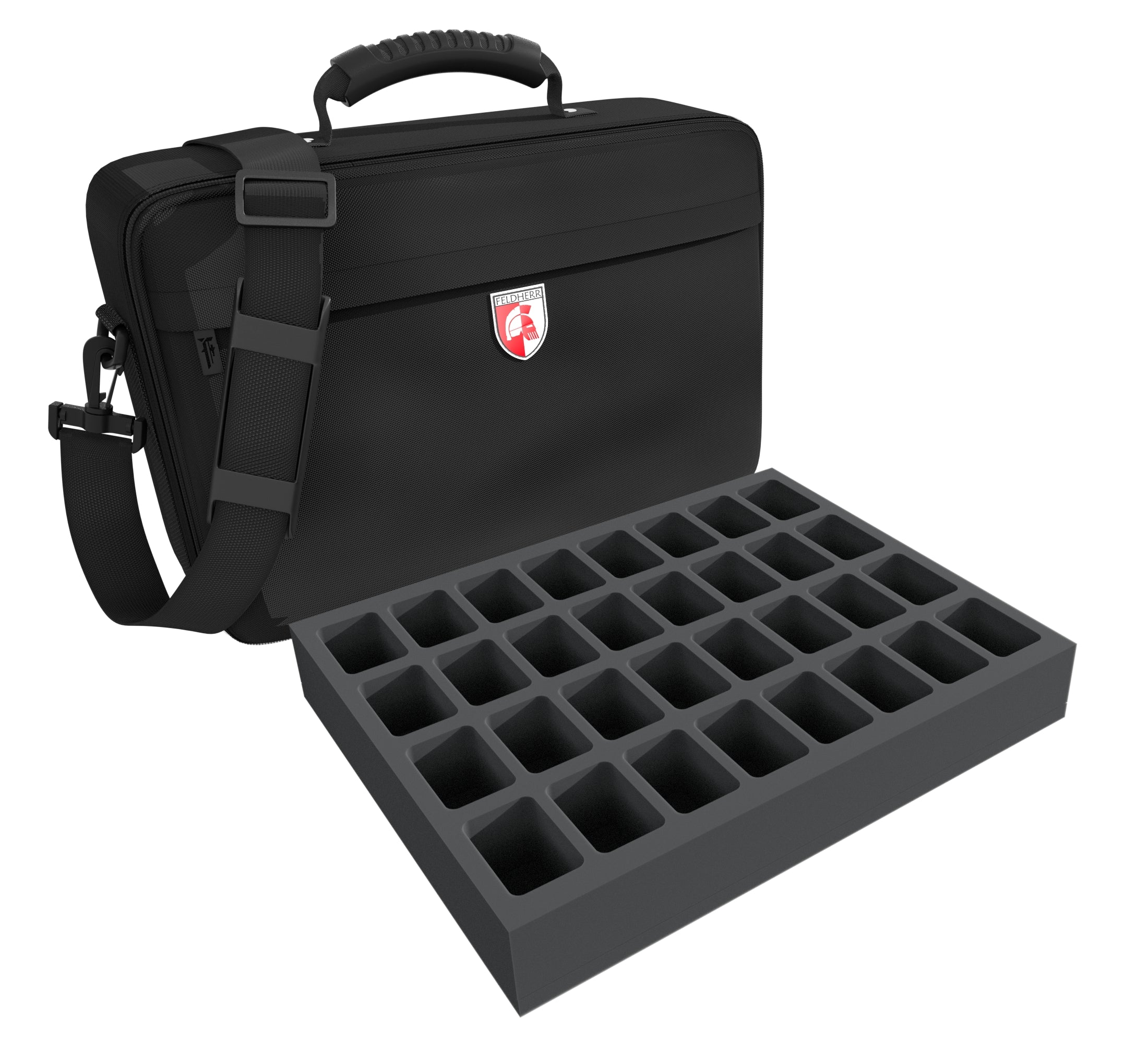 - Proporciona orden. 1 bandeja de espuma Full-Size con 32 compartimentos, 2 bandejas de espuma Half-Size con 10 y 12 compartimentos respectivamente. De este modo, hasta 54 miniaturas están claramente organizadas y siempre al alcance de la mano. La bandeja de espuma Half-Size con 10 compartimentos es especialmente adecuada para guardar figuras más grandes como Star Players. Por supuesto, las bandejas también pueden acomodar otro material de juego como pelotas extra, contadores de equipo o dados.