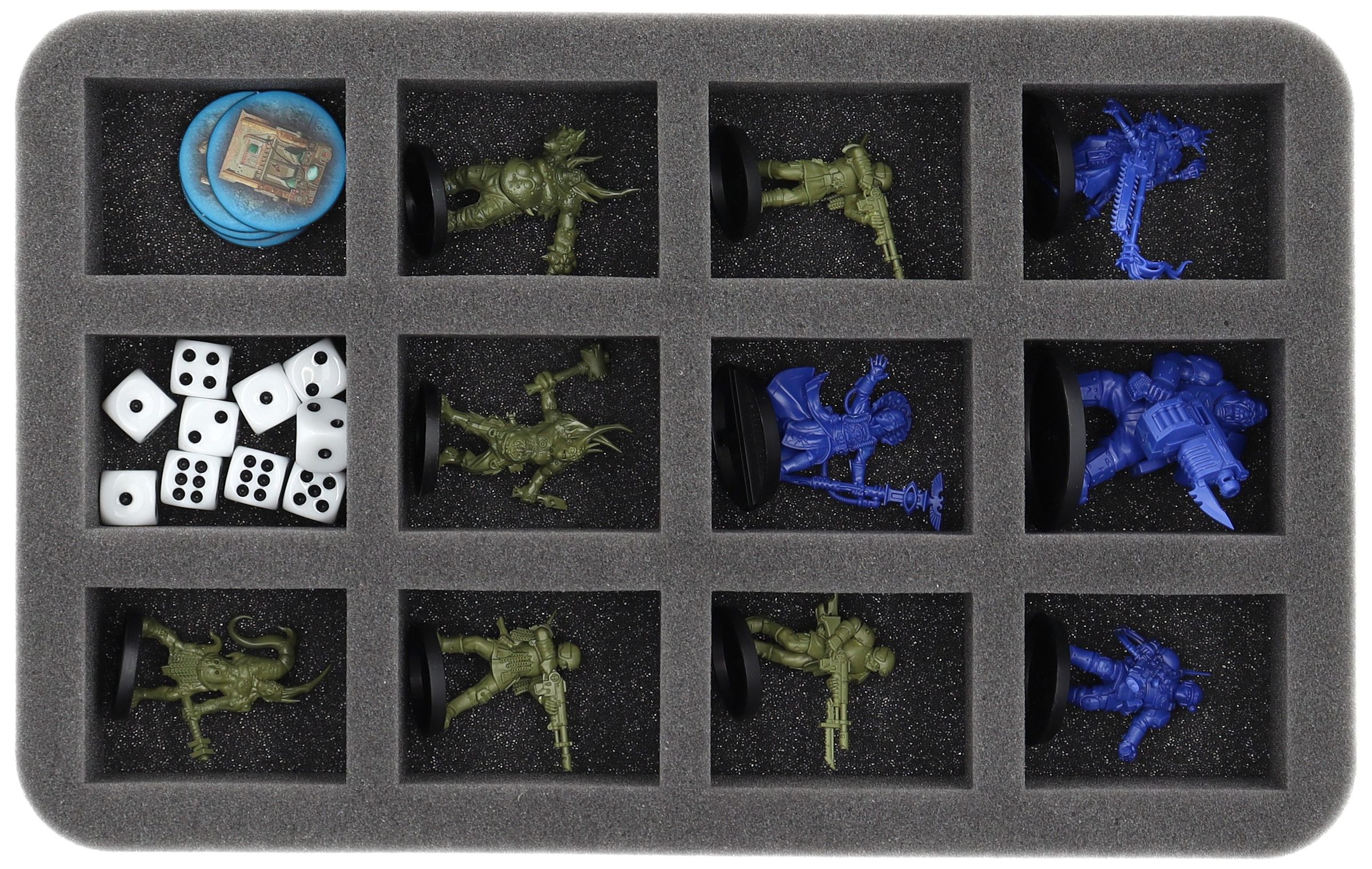 - 1 Bandeja de espuma de tamaño medio con 12 compartimentos para miniaturas como Caminantes de la viruela, Guardias traidores y miniaturas de tamaño similar (HS050I012BO)
