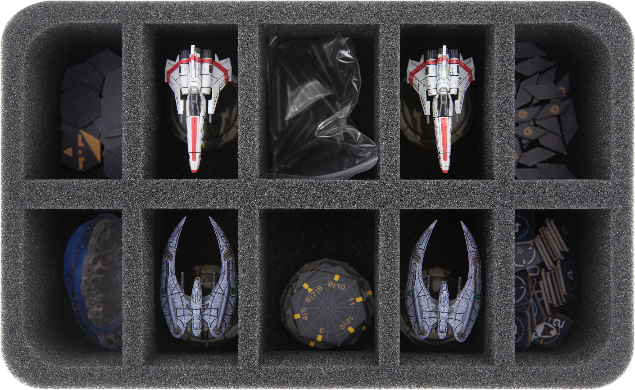 Sus naves espaciales están estacionadas en la bandeja de espuma con 10 compartimentos. La espuma de poros finos proporciona la máxima protección: las alas permanecerán intactas y las superficies no se rayarán. Además de las naves espaciales, la bandeja te ayudará a clasificar el material de juego como, por ejemplo, dados, fichas y marcadores.