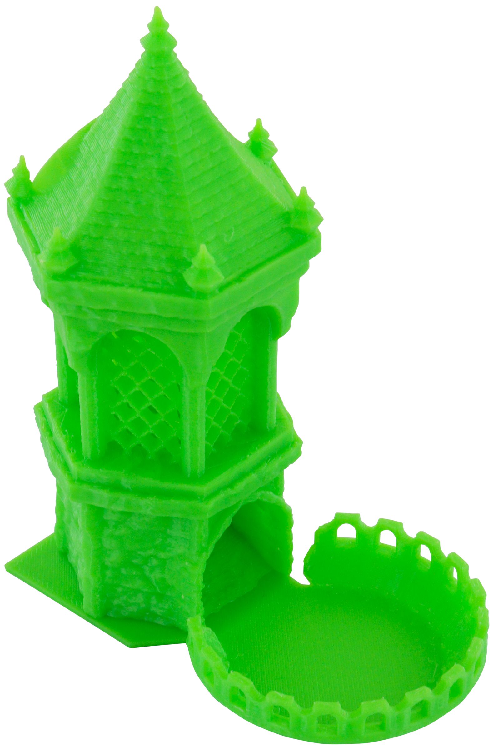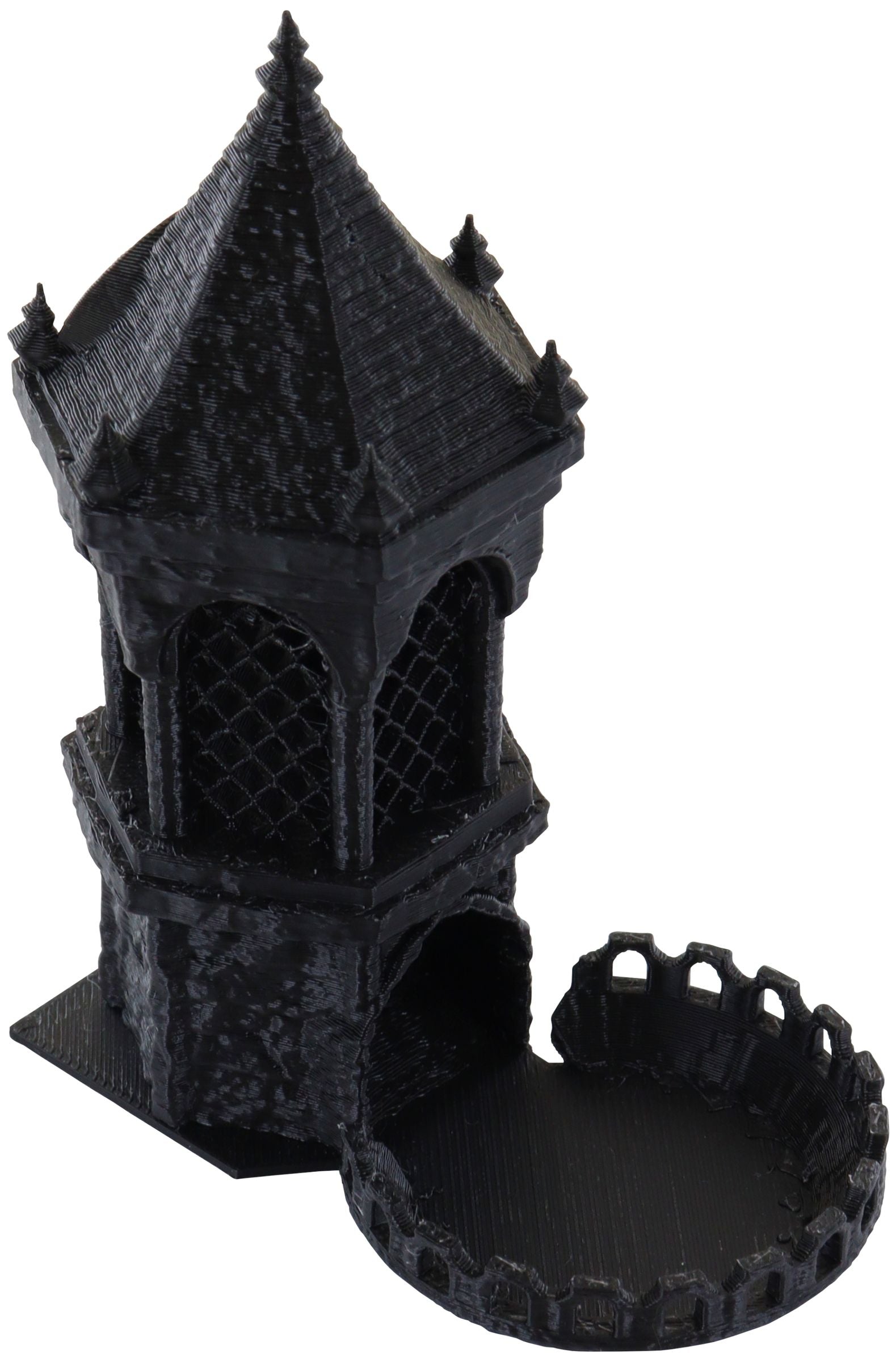 La parte inferior de la torre de dados se guarda por separado en el Case y puede engancharse fácilmente a la torre.Mide 45 mm de ancho x 76 mm de largo x 12 mm de alto.