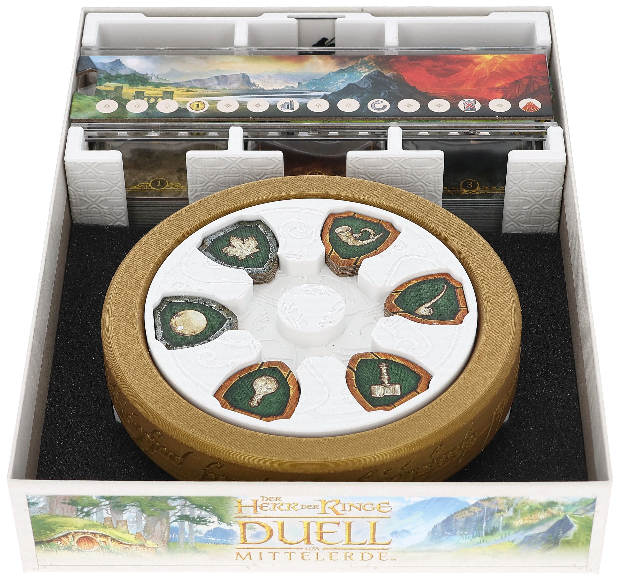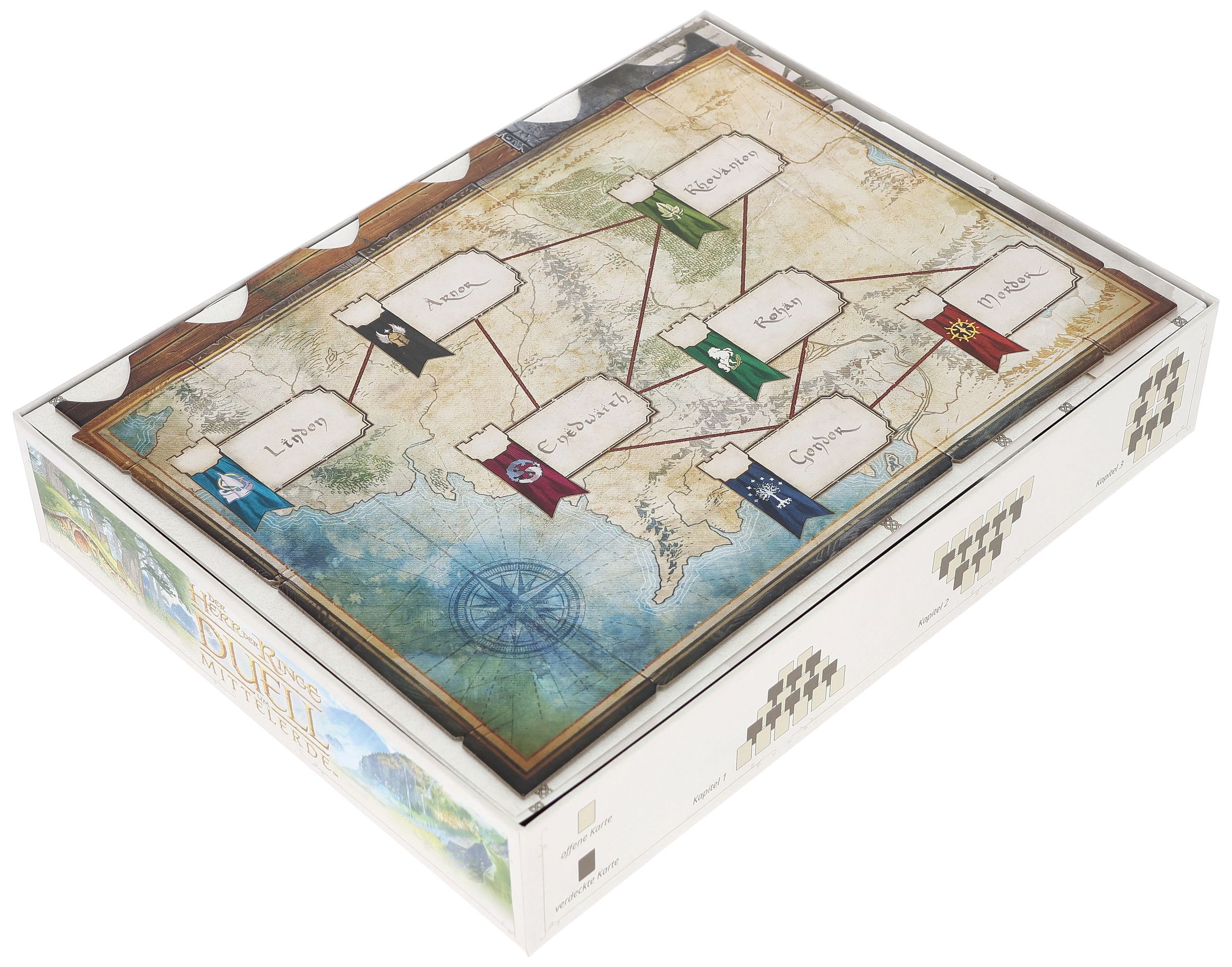 En la batalla por la Tierra Media, cada carta decide el resultado de la lucha entre el bien y el mal. Para que puedas concentrarte plenamente en tus tácticas, nuestro Organizador Feldherr no sólo embellece tu juego, sino que también mantiene todo ordenado en la caja y en la mesa de juego... todo está bien guardado, rápidamente accesible y ordenado de forma estructurada.