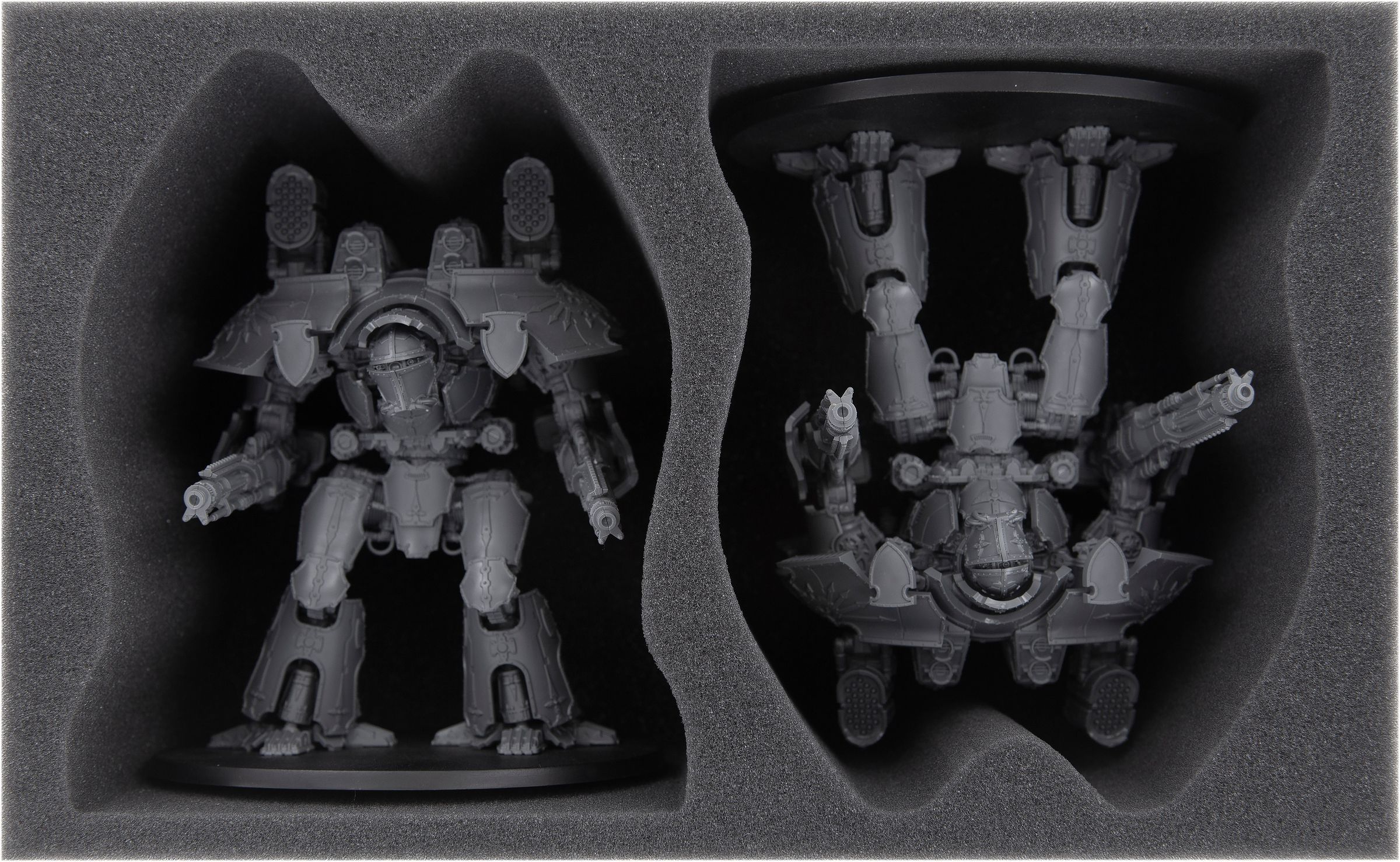 Una de las bandejas alberga a los dos Titanes de los Señores de la Guerra. Estos se colocan aquí por separado en dos compartimentos hechos a medida. Esto asegura que las miniaturas no se deslicen ni choquen durante el transporte. De este modo, se evitan arañazos y descascaramientos en los modelos pintados con esmero.