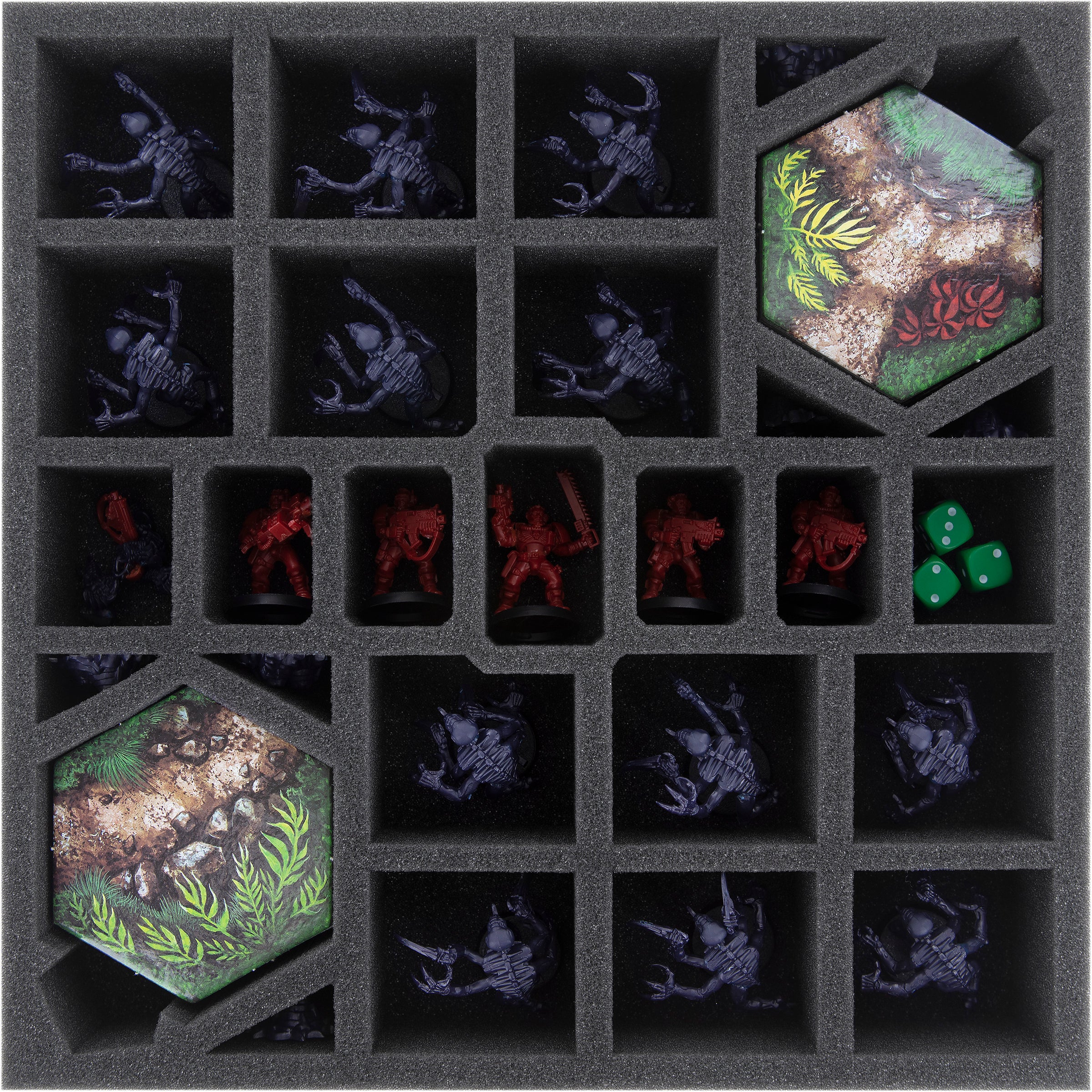 Para las miniaturas tienes 23 compartimentos a tu disposición. Los exploradores de los Marines Espaciales se alinean en el centro de la bandeja de espuma, rodeados, como en la selva, por los modelos Genestealer. Los seis marcadores de infestación de los Xenos están guardados en los pequeños compartimentos triangulares junto a las baldosas del mapa.