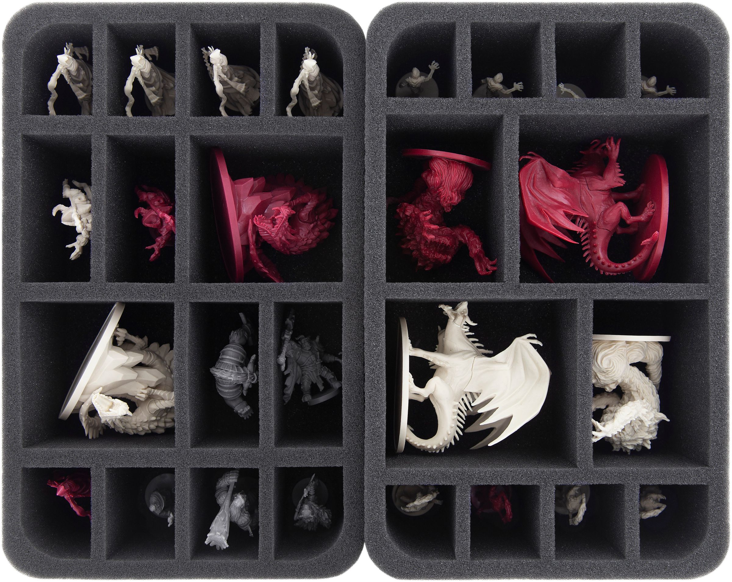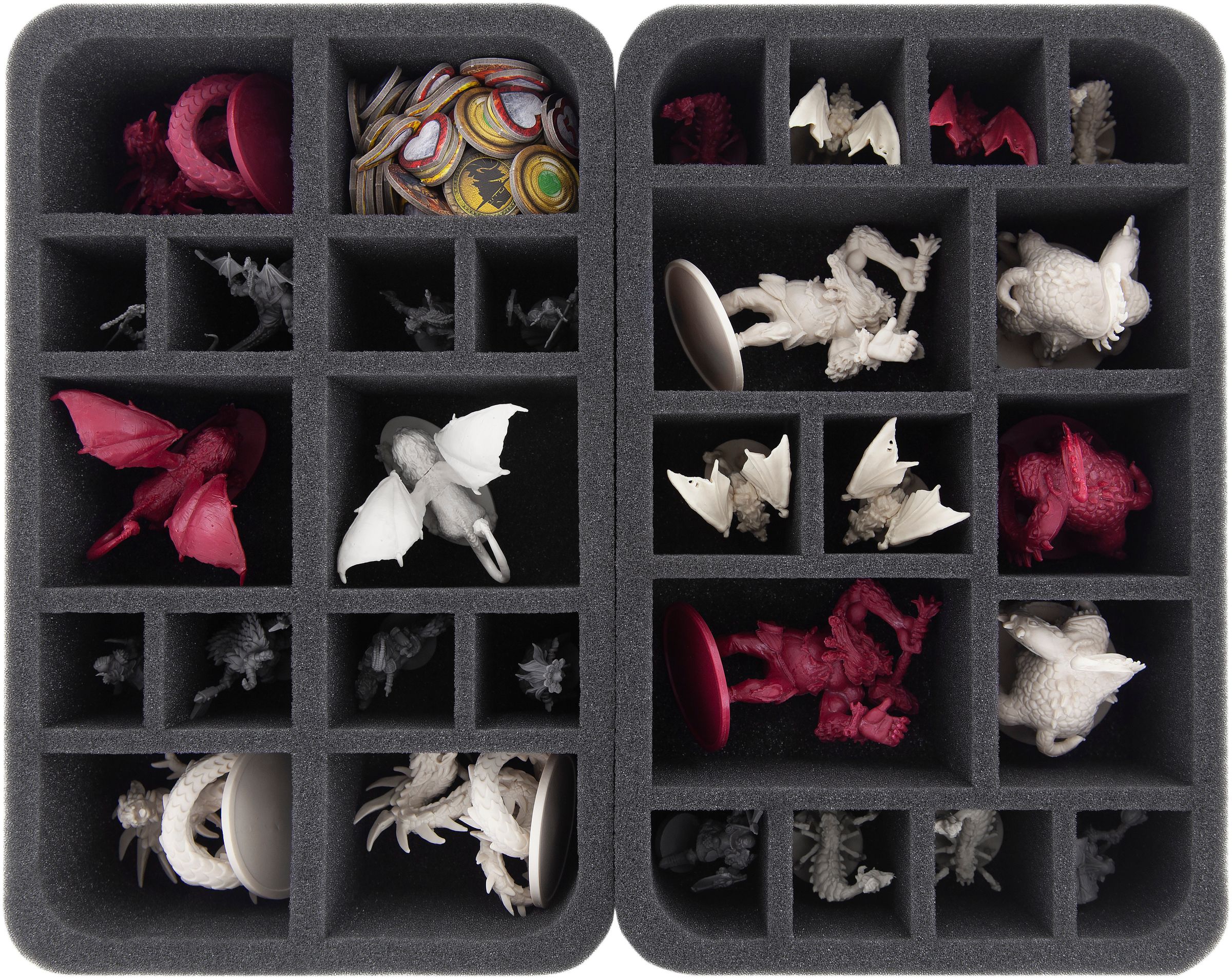 10 bandejas de espuma a medida aseguran que todas tus miniaturas de héroe y monstruo estén acolchadas suavemente. Desde los Dragones de la Sombra hasta las Arpías y las Arañas de las Cuevas, hay un compartimiento adecuado para cada miniatura.