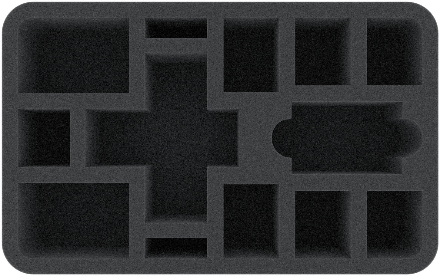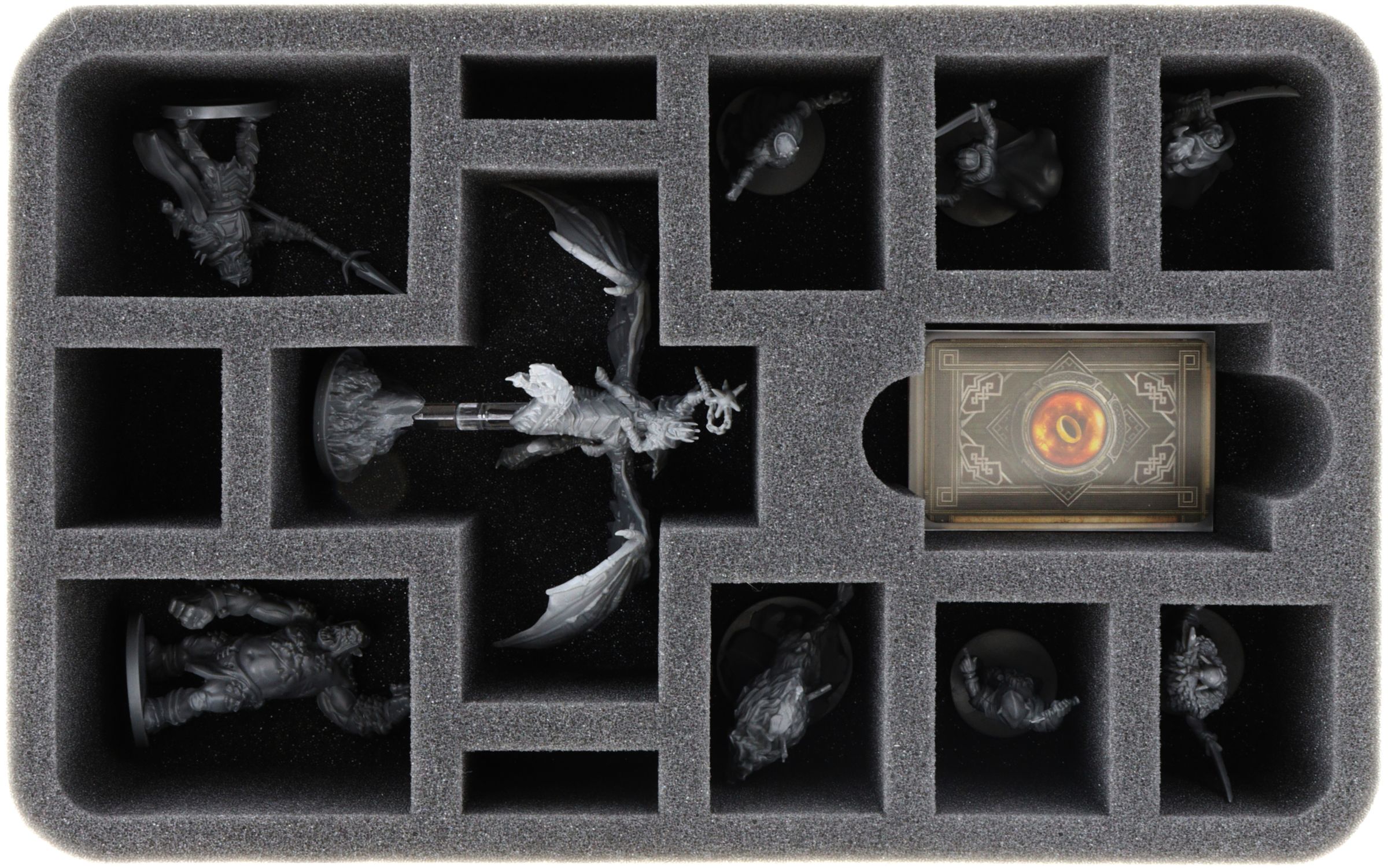 Este bandeja de espuma de 70 mm de alto está dividido en 13 compartimentos. Ya sea el Rey Brujo o Golgotar, cada miniatura tiene su propio compartimento. El corte a medida garantiza que las figuras tengan un asiento firme y no se deslicen durante el transporte. El suave espuma protege de forma fiable los detalles sensibles de posibles daños. Los colores de las figuras pintadas también están a salvo, ya que el espuma evita la abrasión de los colores y los arañazos.