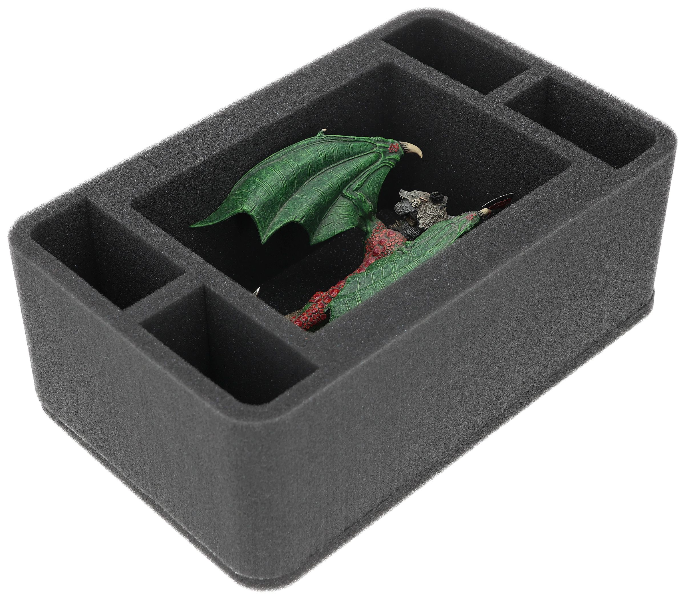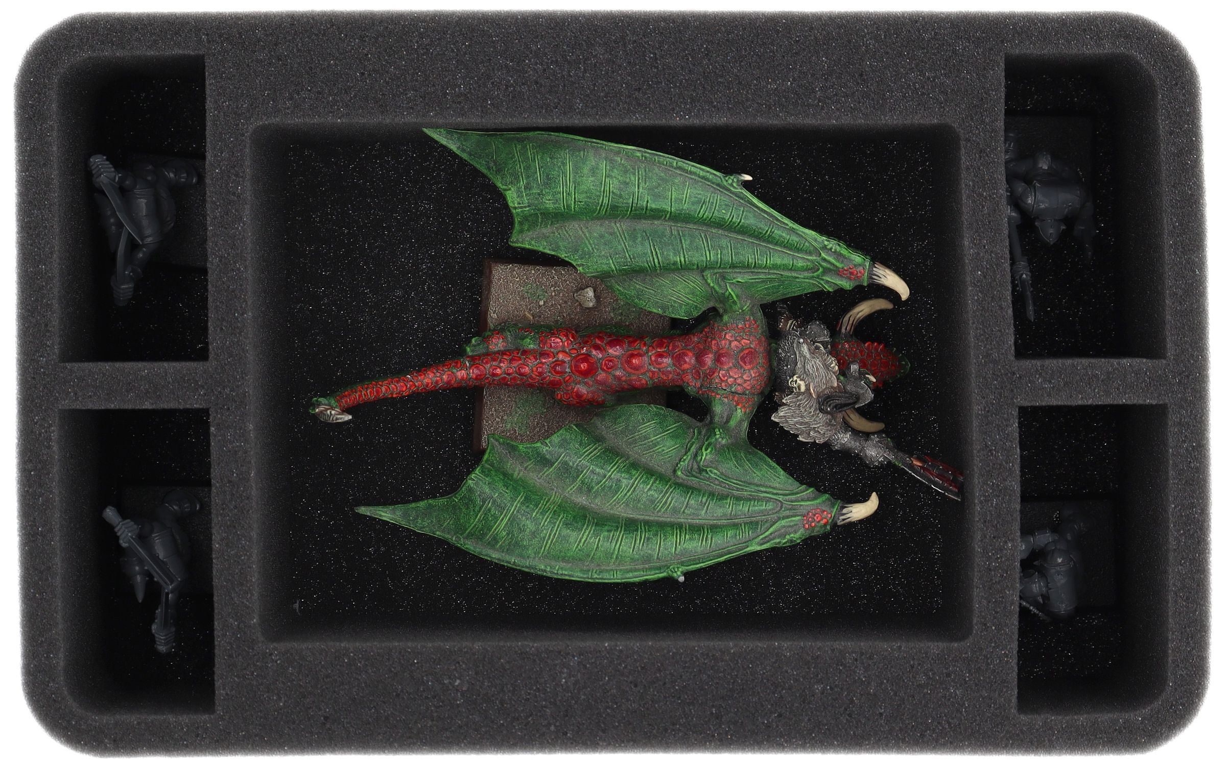 En este Feldherr bandeja de espuma tienes espacio para hasta 5 miniaturas de tu ejército. El inserto es especialmente adecuado para almacenar el Orc Warboss en Wyvern, unidades de infantería estándar y modelos de tamaño similar.