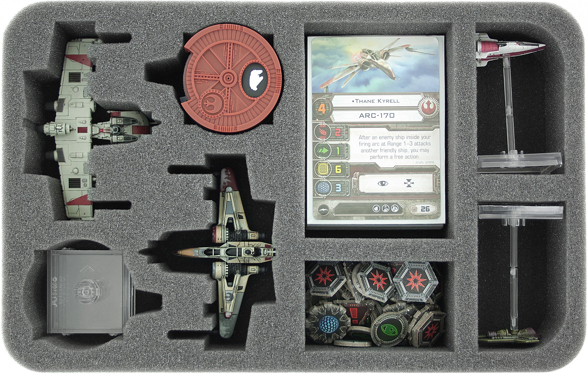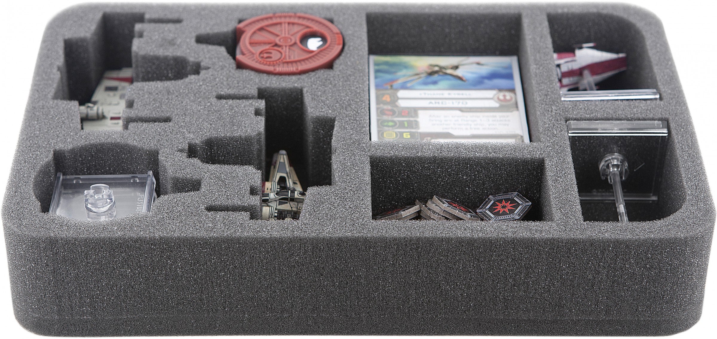 Bandeja de espuma con ranura híbrida que ahorra espacio para 2 x X-WING Wave 9 ARC-190 y/o K-WING y/o HWK-290. Además, las ranuras de marcación de base híbrida se adaptan a las esferas (con o sin kit de mejora de la marcación de maniobra) y/o bases y/o naves Y-WING.