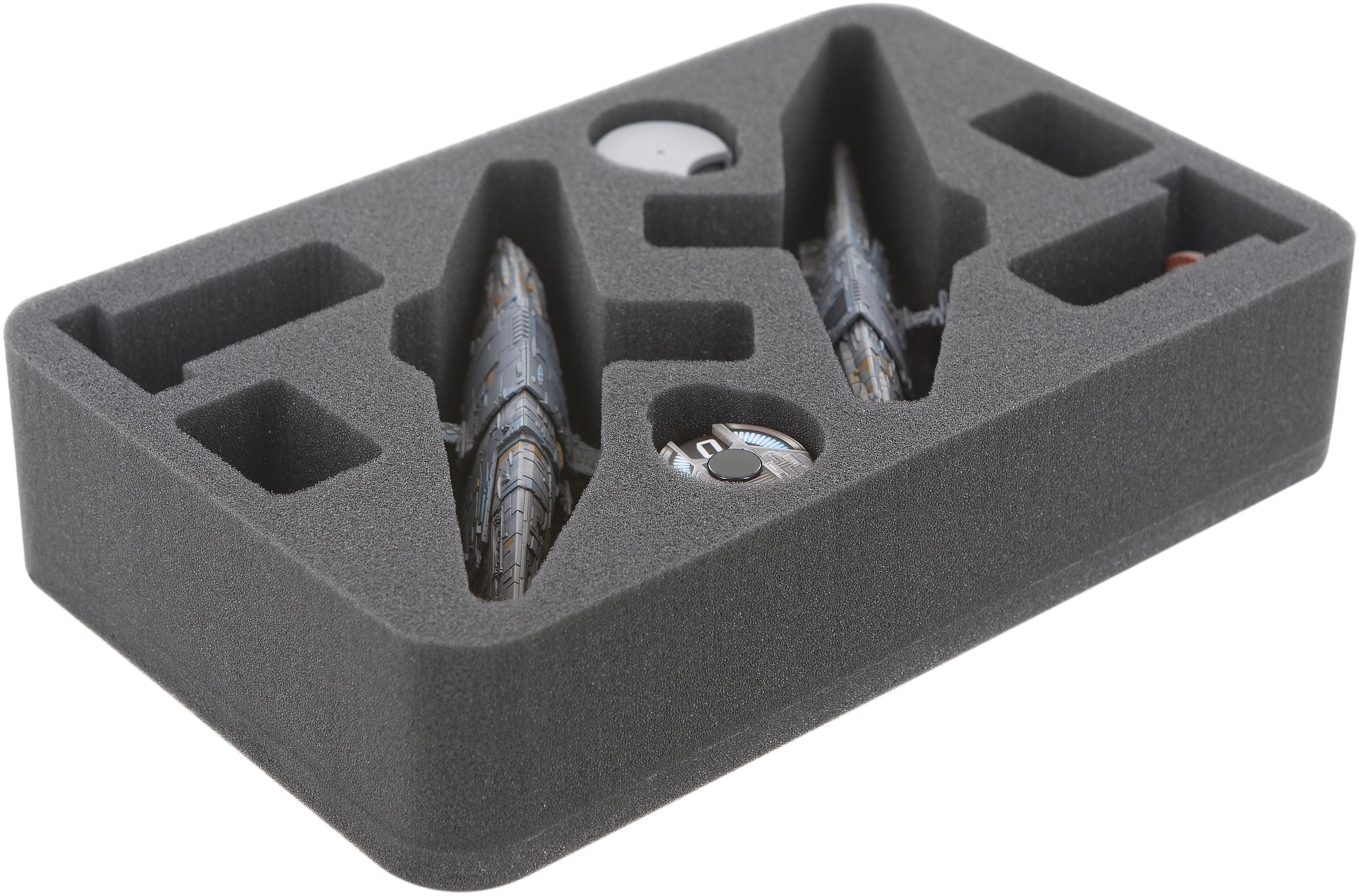 Protéjase de la Profundidad de la Armada de la Guerra de las Galaxias. En este inlay Half-Size puede almacenar 2 MC75 Profundity. También hay recortes para esferas y otros barcos. La bandeja de espuma está especialmente desarrollada para MC75 Profundity. Todo el material de juego y el crucero están perfectamente protegidos por los compartimentos de diseño individual.