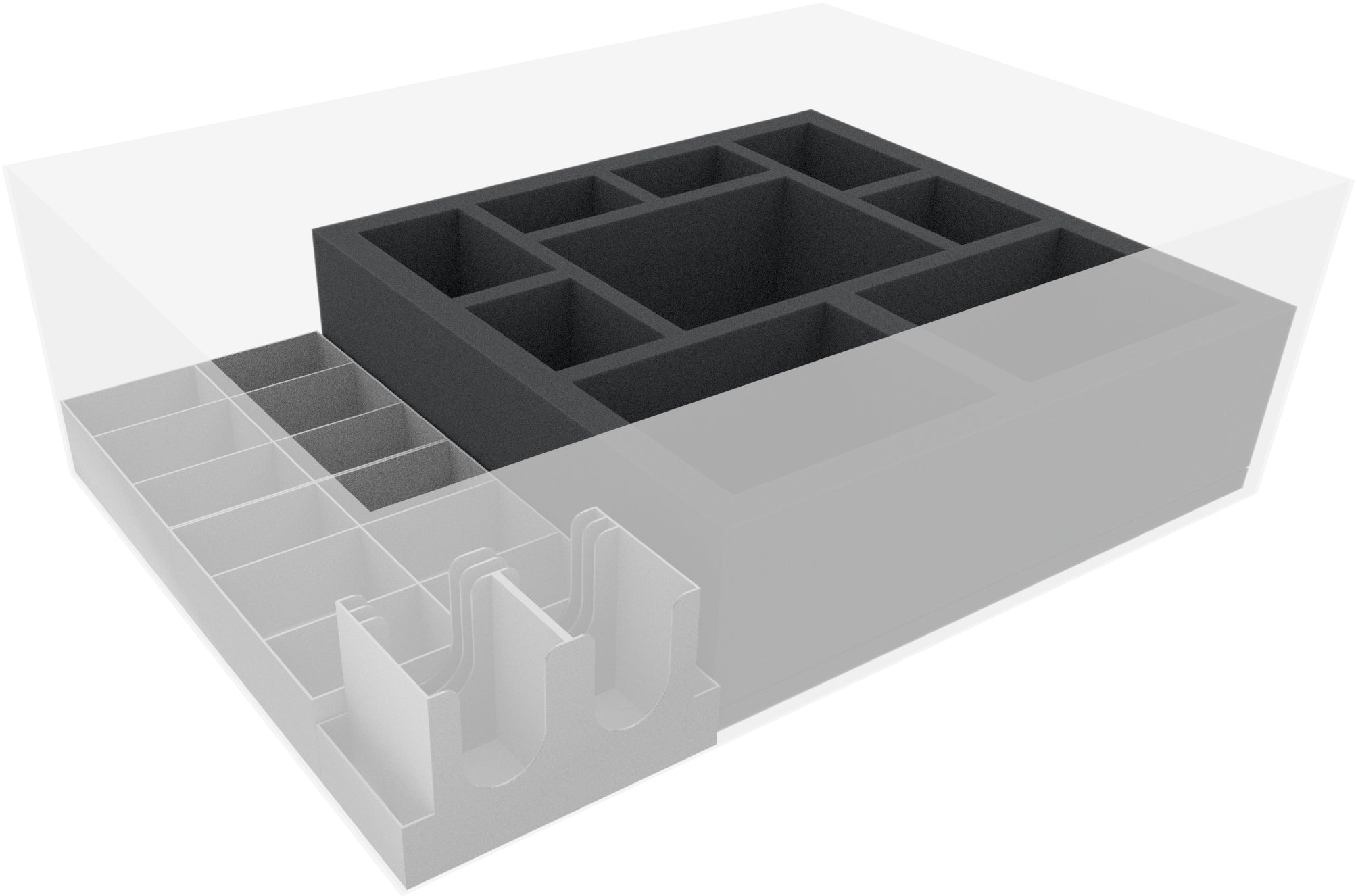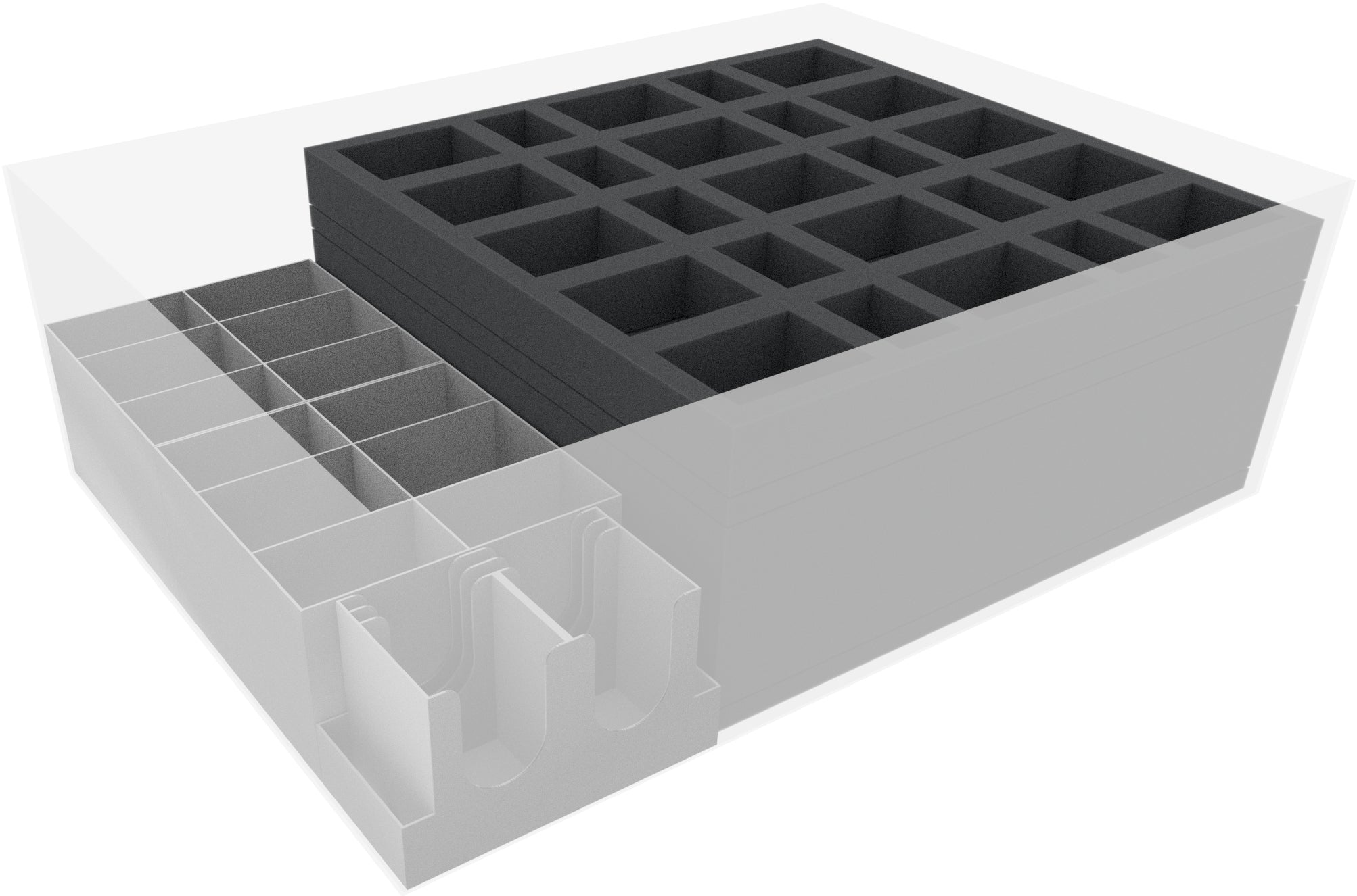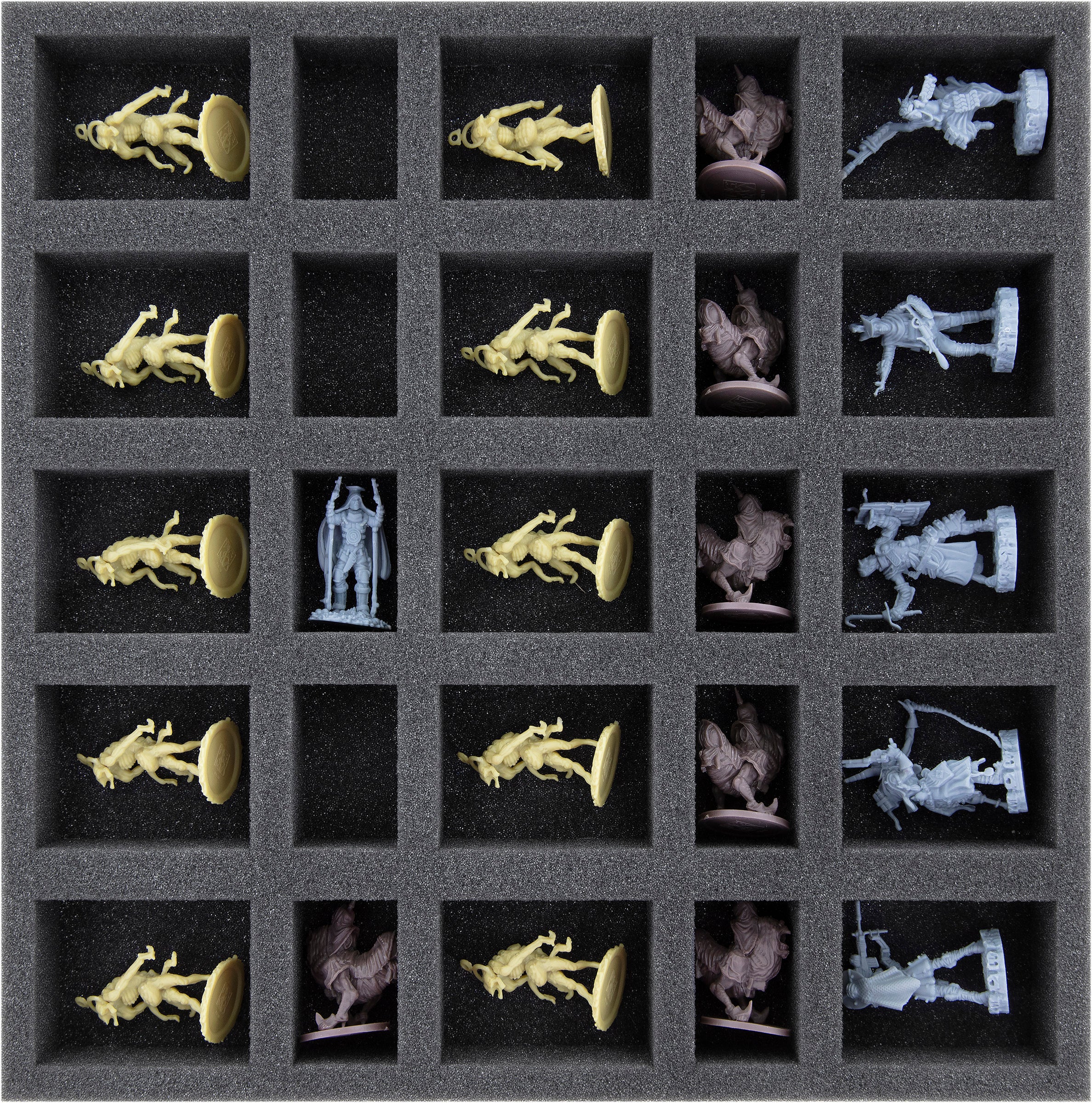 Five small foam mats compensate for height differences within the box. Place them on or underneath the plastic trays. Finally, cover everything with the included foam topper. This way, you can make sure that none of your figures will bump against the lid of the board game box during transport.
