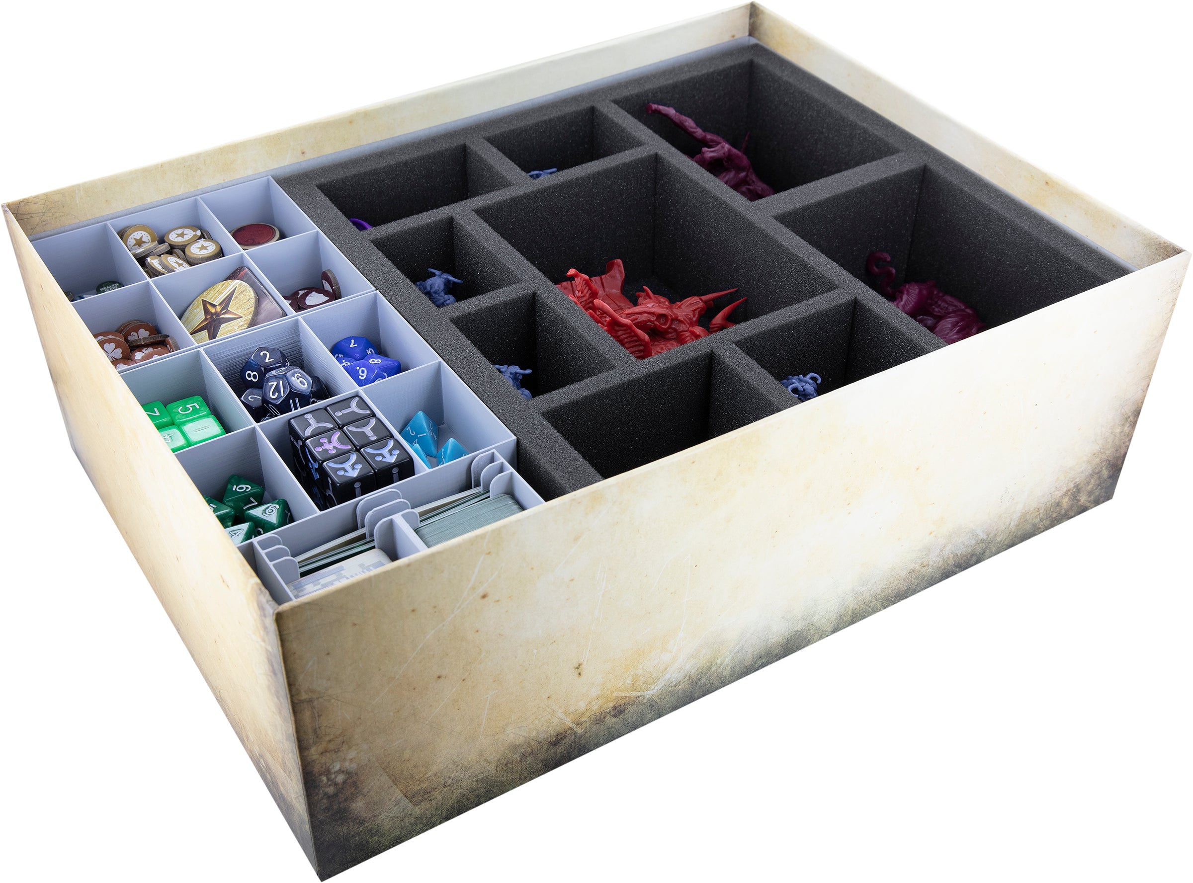 Who cares about the end of the world when there is chaos and disorder in your box? To help you close the gates of hell without worry, we take care of the organization in your core game box and the protection of your miniatures. Your miniatures are safely stored in soft foam inserts and your game material can be neatly sorted using the tokens and card holders. Thus, you save time setting up the game and can invest the time gained into playing.