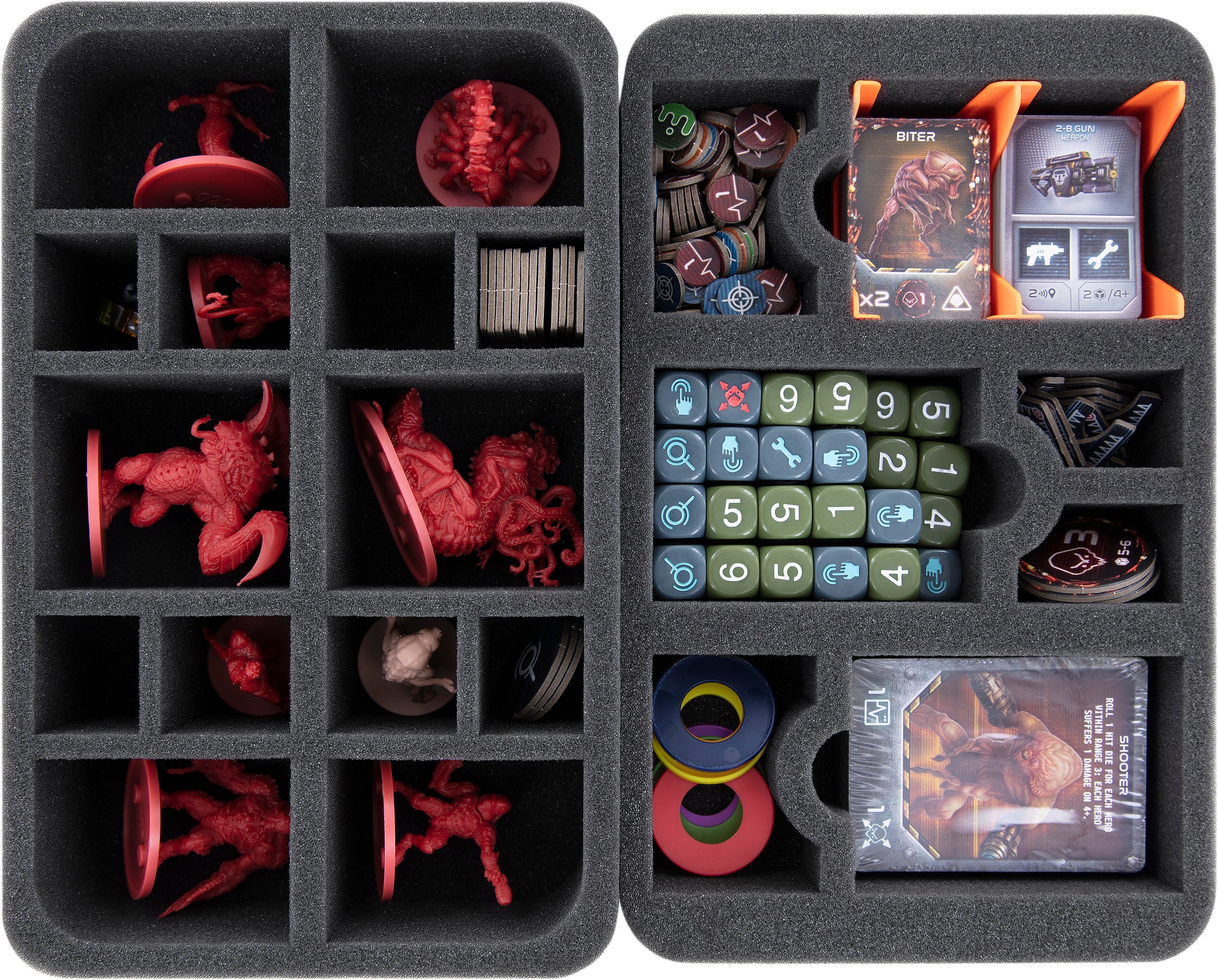 In order to give the somewhat larger Boss models optimal protection, we added a Half-Size foam tray (HSMEDQ065BO) with 14 compartments to the set. Once you've stowed away your boss miniatures, the remaining compartments can be used to store remaining swarm models and accessories such as damage markers and exploration tokens.