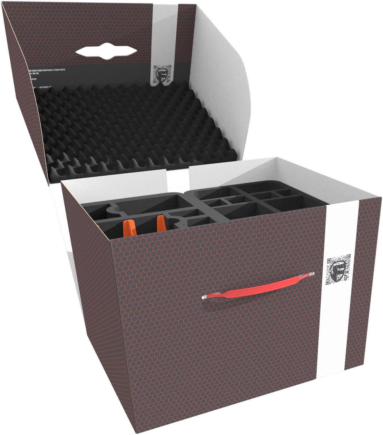 The Storage Box FSLB250 is made of coated, double-walled cardboard. This makes it not only pleasantly light, but also particularly tear-resistant and stable. With the matching foam trays, miniatures and game material can be stored safely and dust-protected and can also be transported effortlessly with the plastic carrying handle. To make it easier to store and remove the foam mats, one side of the box can be opened completely. The trays are either inserted from above or simply slided into the box from the side.