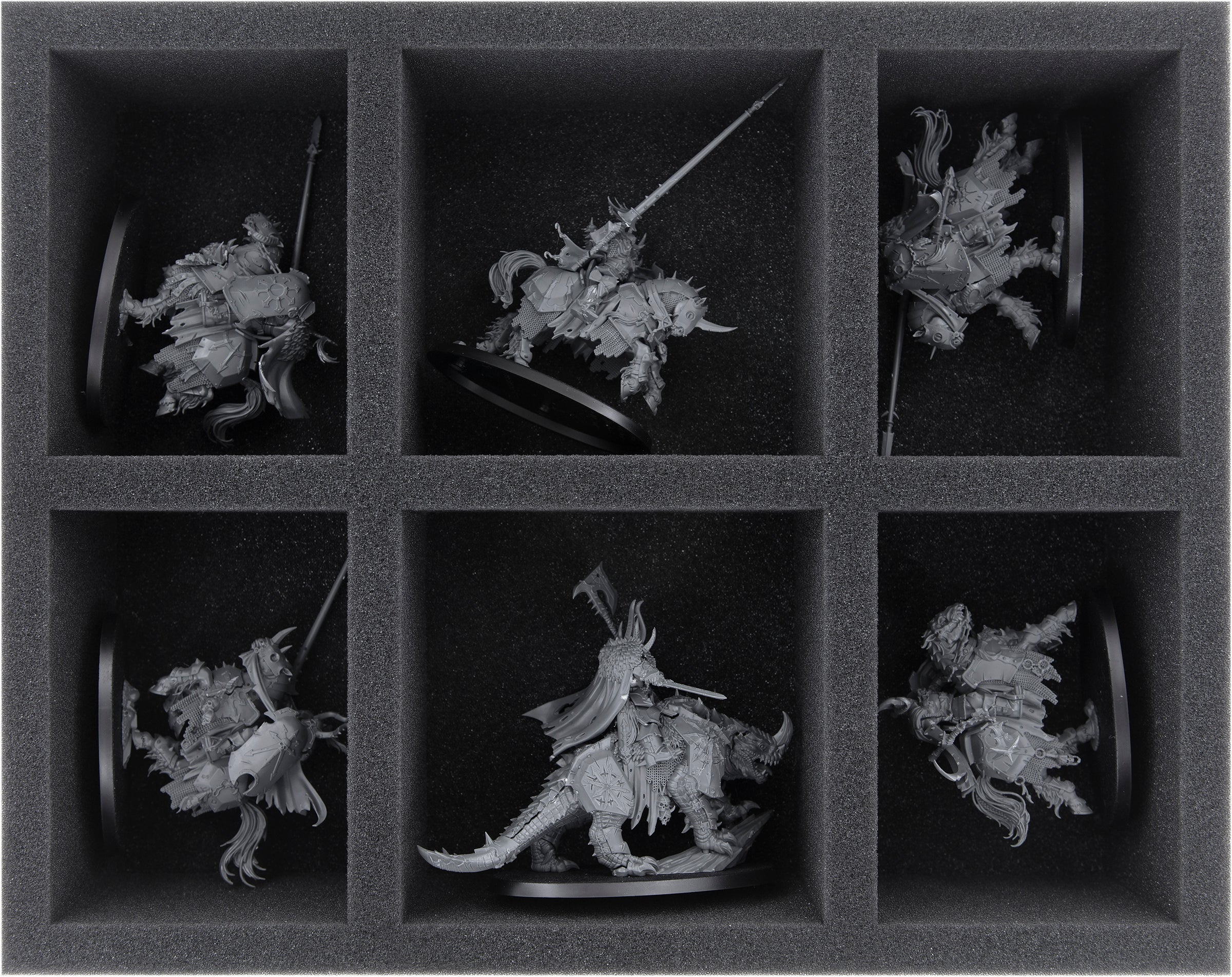 El aspirante a campeón y los otros nueve Guerreros del Caos encontrarán un espacio seguro en una de las dos inserciones del Half-Size. Aquí cada figura tiene su propio compartimento. Así que los modelos pintados también están a salvo de la abrasión, la pintura descascarada y los arañazos durante el transporte.