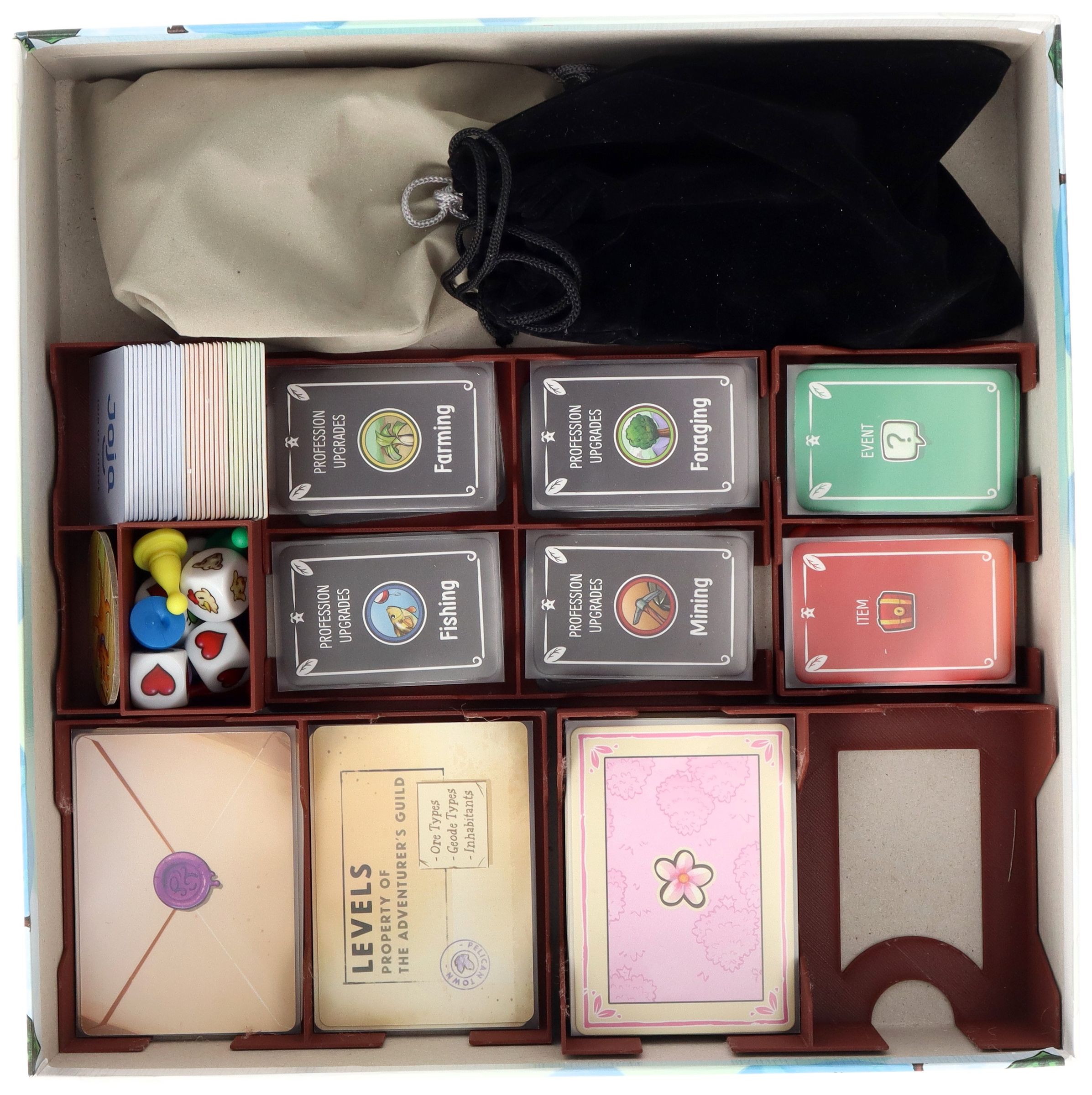 Although the cute design appeals to the younger target group, Stardew Valley is a complex board game where you can quickly lose track of everything. To ensure that doesn't happen to you, we've taken control of your board game box and lent you a hand. The six card holders and three token holders ensure that your game material stays neatly sorted in the box and on the tabletop. The Organizer's clear structure enables you to set up the game quickly. Tedious pre-sorting is a thing of the past. Take the inserts out of the box and distribute them on the tabletop. You can place the card holders on and next to the game board and even use the large card holder to draw and discard your stacks of cards. So everything is ready, and you can start right away.