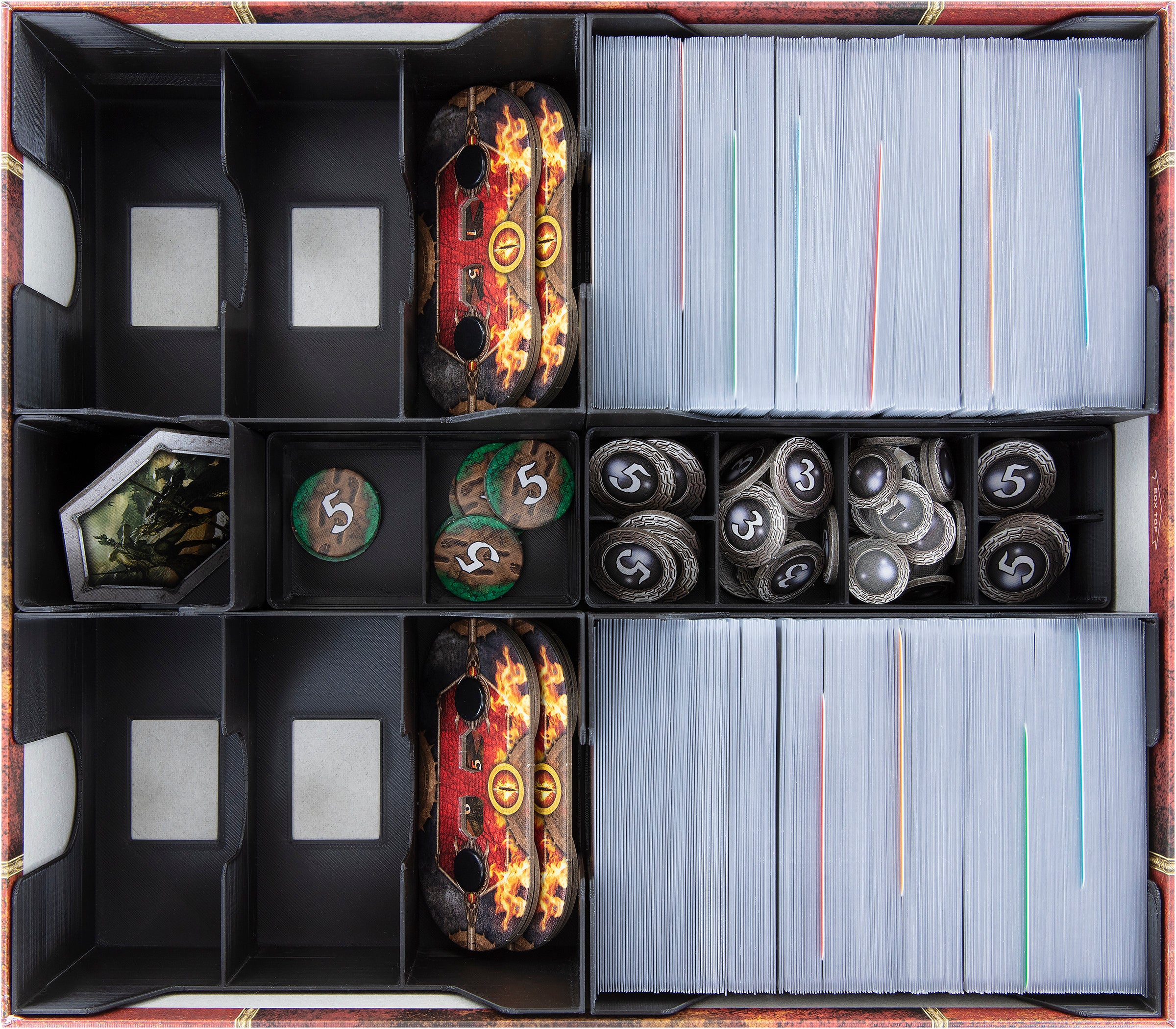 • 4 card holders, each with 3 compartments, for game cards like Hero cards, Player cards, Encounter cards, and Quest cards, as well as for the threat trackers.